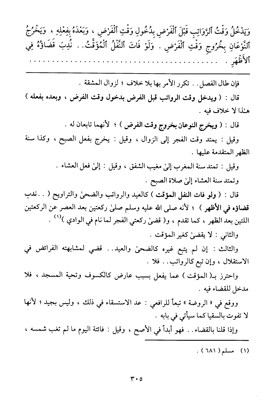 وَيَدْخُلُ وَقْتُ اَلْرَوَاتَبِ قَبْلَ اَلْفَرضِ بِدُخُولِ وَقْتِ اَلْفَرضِ، وَبَعْدَهُ بِفِعْلِهِ، وَيَخْرُجُ اَلنَّوْعَانِ بِخْرُوجِ وَقْتِ اَلْفَرْضِ. وَلَوْ فَاتَ اَلْنَّقْلُ الَمْؤُقَّتُ .. نُدِبَ قَضَاؤُهُ فِي اَلأَظْهَرِ