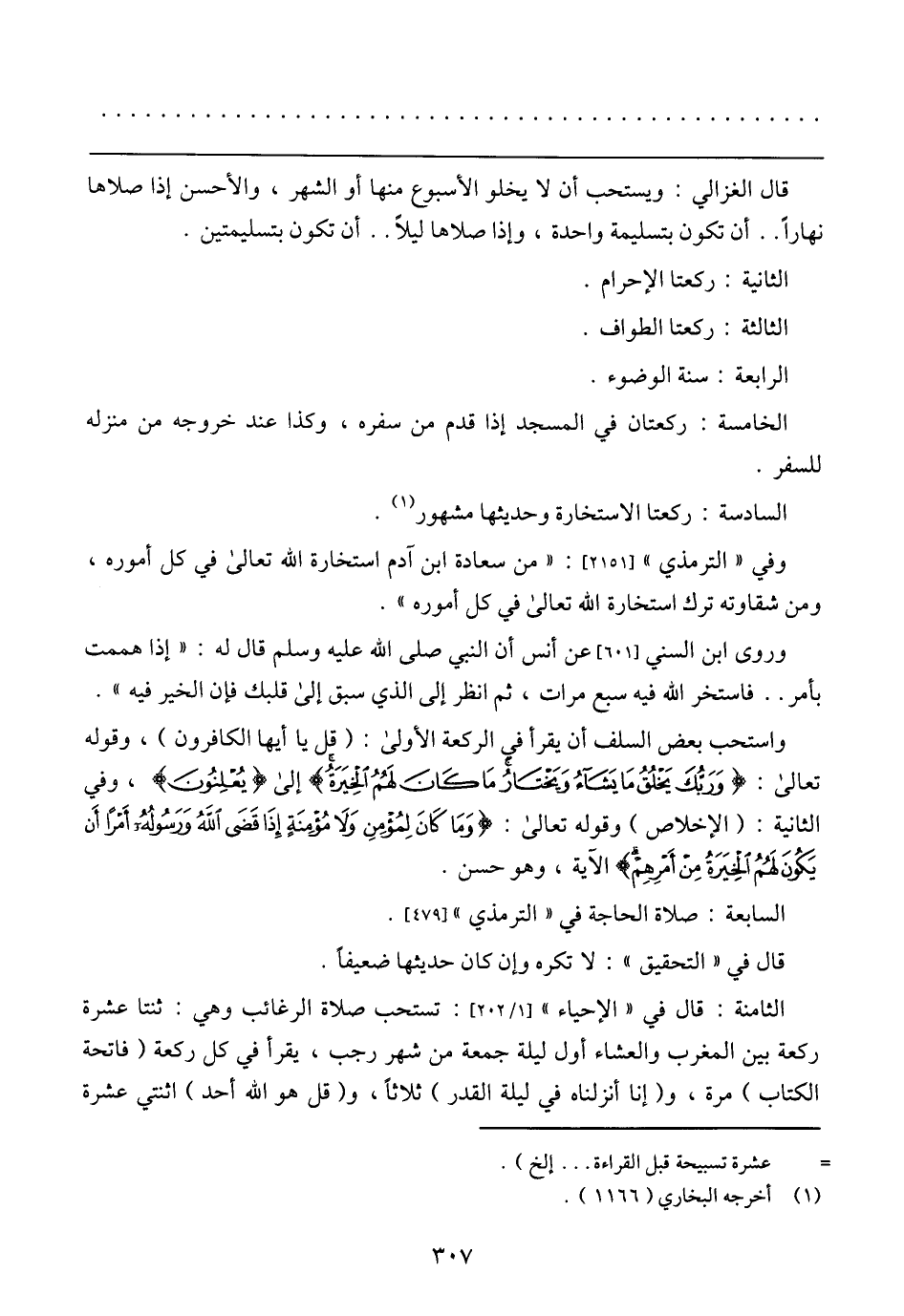 الثامنة: قال في (الإحياء) [1/ 202]: تستحب صلاة الرغائب وهي: ثنتا عشرة ركعة بين المغرب والعشاء وأول ليلة جمعة من شهر رجب، يقرأ في كل ركعة (فاتحة الكتاب) مرة، (وإنا أنزلناه في ليلة القدر) ثلاثًا، و (قل هو الله أحد) اثنتى عشرة