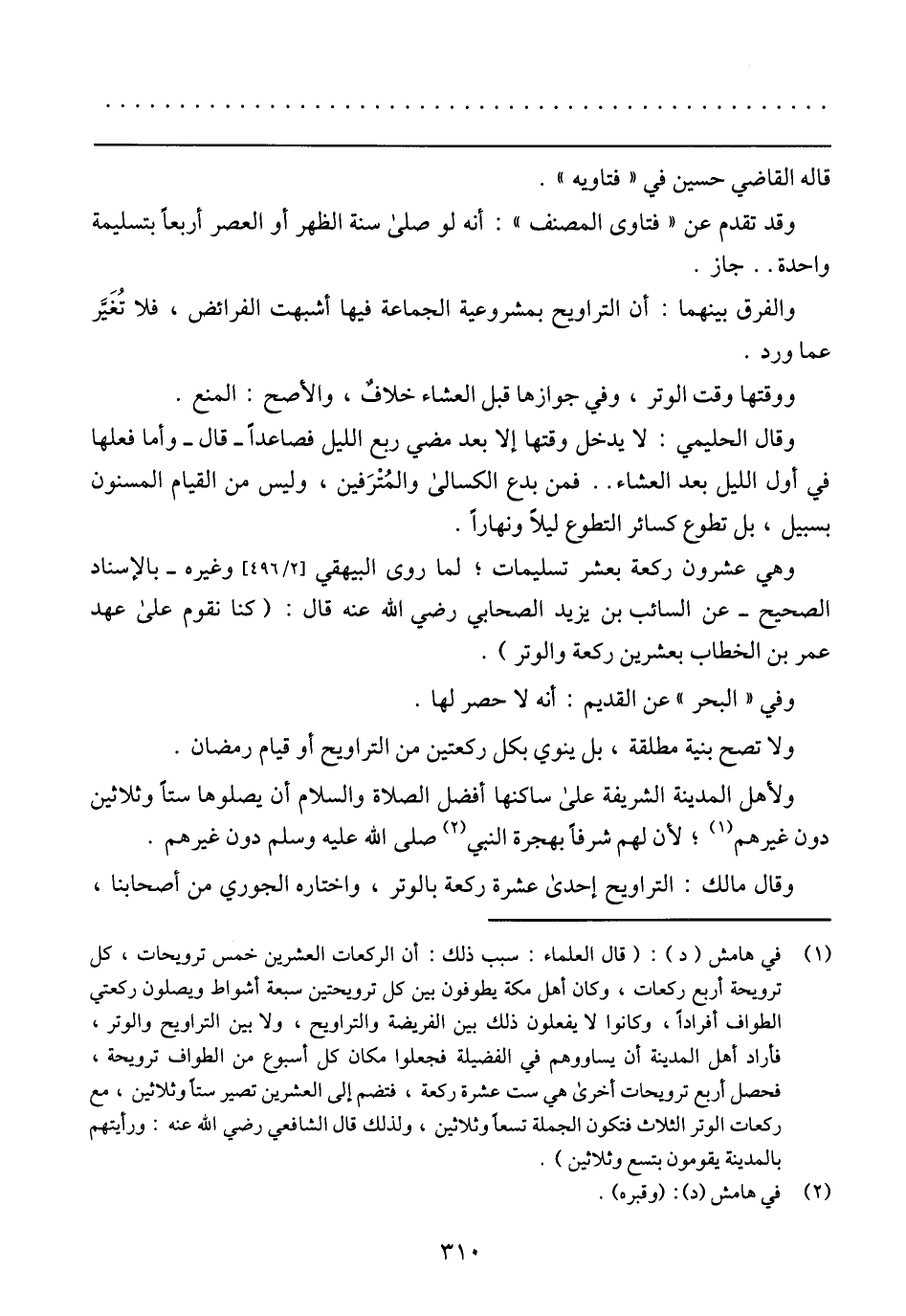 وهي عشرون ركعة بعشر تسليمات؛ لما روي البيهقي [2/ 496] وغيره - بالإسناد الصحيح - عن السائب بن يزيد الصحابي رضي الله عنه قال: (كما نقوم على عهد عمر بن الخطاب بعشرين ركعة والوتر).