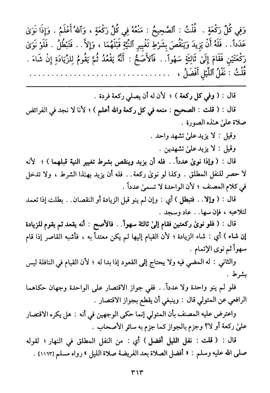 وَفِي كُلِّ رَكْعَةٍ. قُلْتُ: اَلْصَّحِيحُ: مَنْعُهُ فِي كُلِّ رَكْعَةٍ، وَاللهُ أَعْلَمُ. وَإِذَا نَوَى عَدَدًا .. فَلَهُ أَنْ يَزِيدَ وَيَنْقُصَ بِشَرْطِ تَغْيِيرِ اَلْنِّيَةِ قَبْلَهُمَا، وَإِلاَّ .. فَتَبْطُلُ فَلَوْ نَوَى رَكْعَتَينِ فَقَامَ إِلَى ثَالِثَةٍ سَهْوًا .. فَاَلأَصَحُّ: أَنَّهُ يَقْعُدُ ثُمَّ يَقُومُ لِلزِّيَادَةِ إِنْ شَاءَ. قُلْتُ: نَفْلُ اَللَّيْلِ أَفْضَلُ،