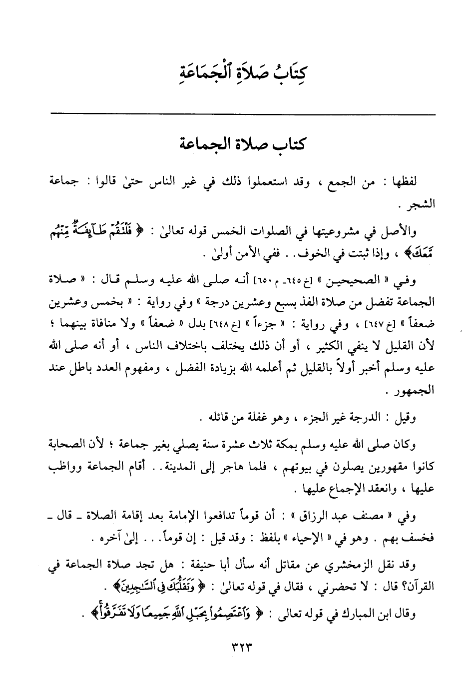 وقد نقل الزمخشري عن مقاتل أنه سأل أبا حنيفة: هل تجد صلاة الجماعة في القرآن؟ قال: لا تحضرني، فقال في قوله تعالى: {واعْتَصِمُوا بِحَبْلِ اللَّهِ جَمِيعًا ولا تَفَرَّقُوا}.