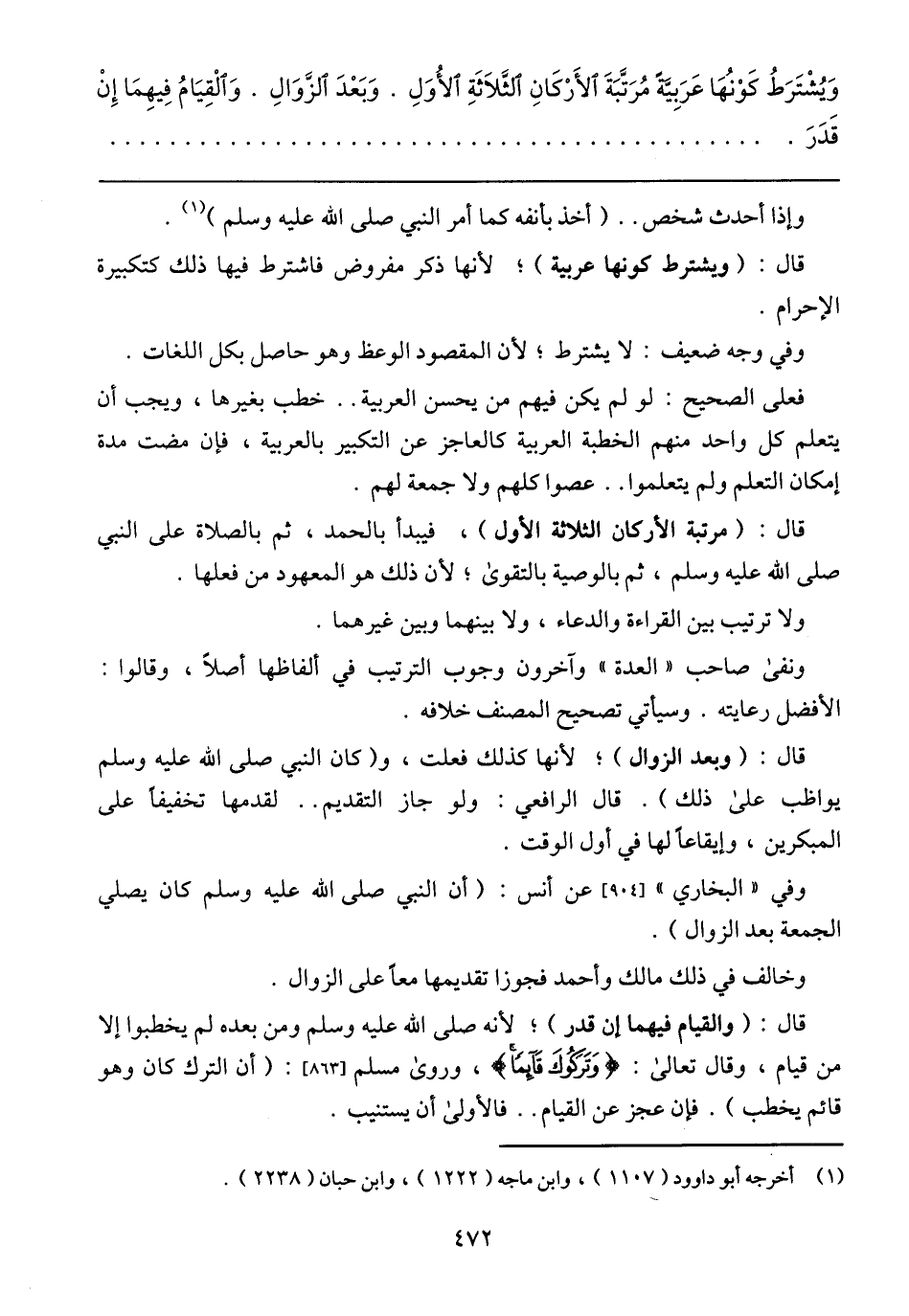 وَيُشْتَرَطُ كَوْنُهَا عَرَبِيَّةً مُرَتَّبَةَ الأَرْكَانِ الثَّلَاثَةِ الأُوَلِ. وَبَعْدَ الزَّوَالِ. وَالْقِيَامُ فِيهِمَا إِنْ قَدَرَ