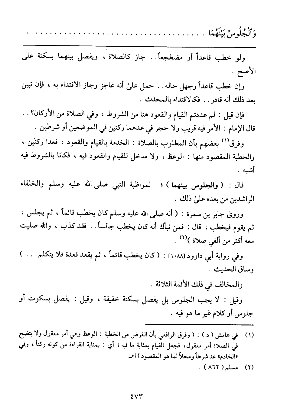وروى جابر بن سمرة: (أنه صلى الله عليه وسلم كان يخطب قائما، ثم يجلس، ثم يقوم فيخطب، قال: فمن نبأك أنه كان يخطب جالسا .. فقد كذب، والله صليت معه أكثر من ألفي صلاة).