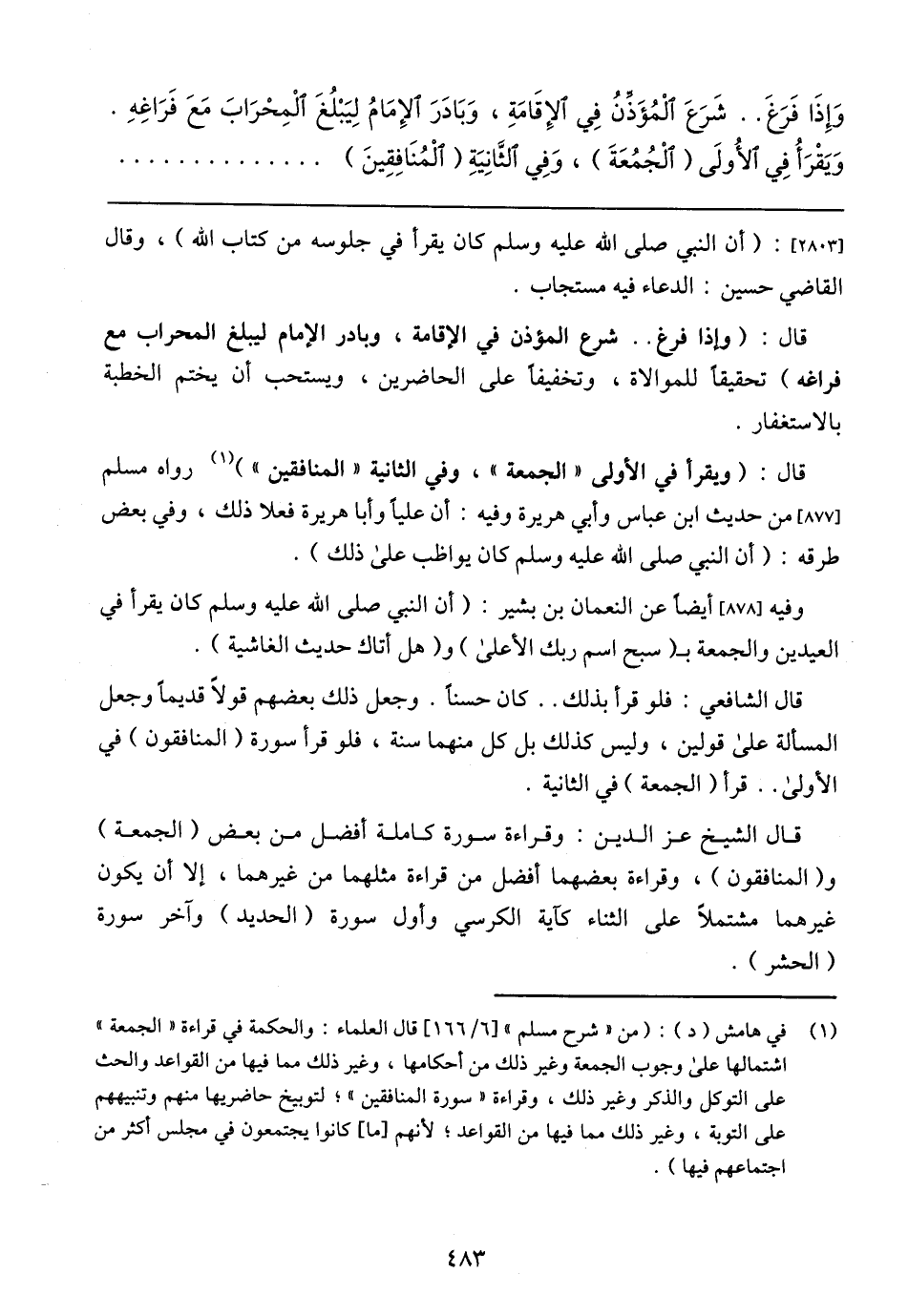 وَإِذَا فَرَغَ .. شَرَعَ الْمُؤَذِّنُ فِي الْإقَامَةِ، وَبَادَرَ الْإِمَامُ لَيَبْلُغَ الْمِحْرَابَ مَعَ فَرَاغِهِ. وَيَقْرَأُ فِي الْأُولَى (الْجُمُعَةَ)، وَفِي الْثَّانِيِةِ (الْمُنَافِقِينَ)