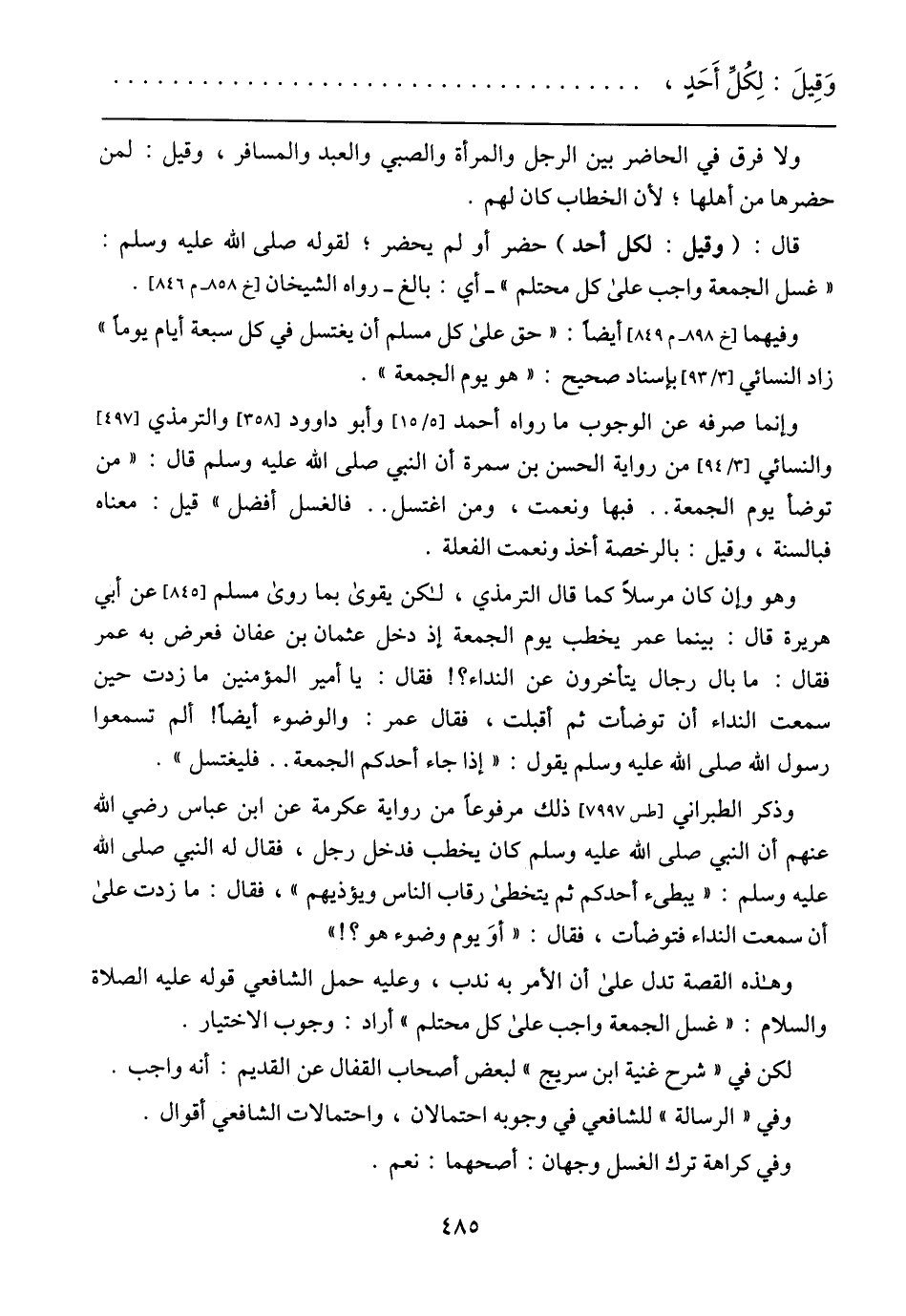 قال: (وقيل: لكل أحد) حضر أو لم يحضر؛ لقوله صلى الله عليه وسلم: (غسل الجمعة واجب على كل محتلم) - أي: بالغ- رواه الشيخان] خ858 - م 846 [.