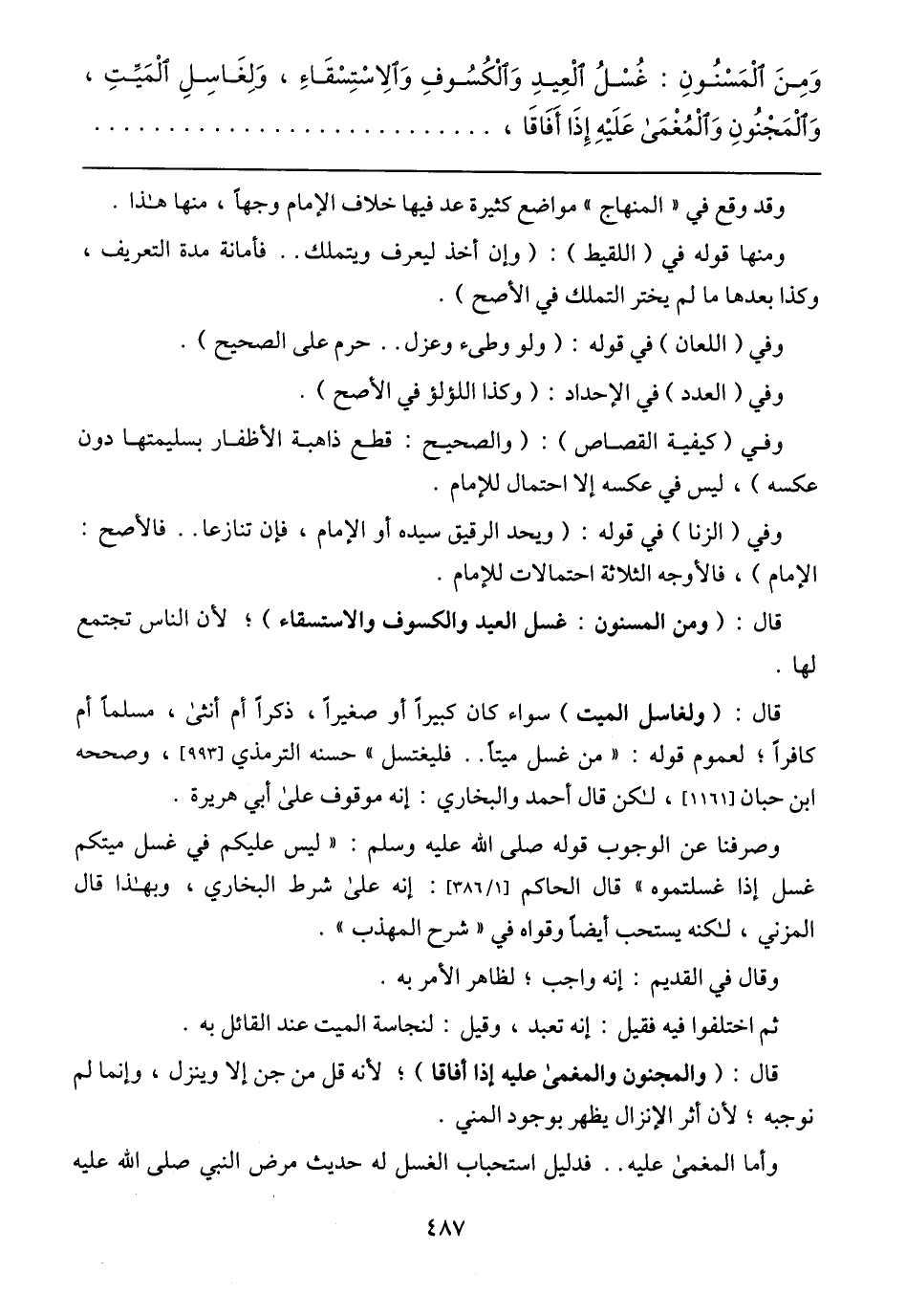 وَمِنْ الْمَسْنُونِ: غُسْلُ الْعِيدِ وَالْكُسُوفِ وَالاِسْتِسْقَاءِ، وَلِغَاسِلِ الْمَيِّتِ، وَالْمَجْنُونِ والْمُغْمَى عَلَيْهِ إَذَا أَفَاقَا