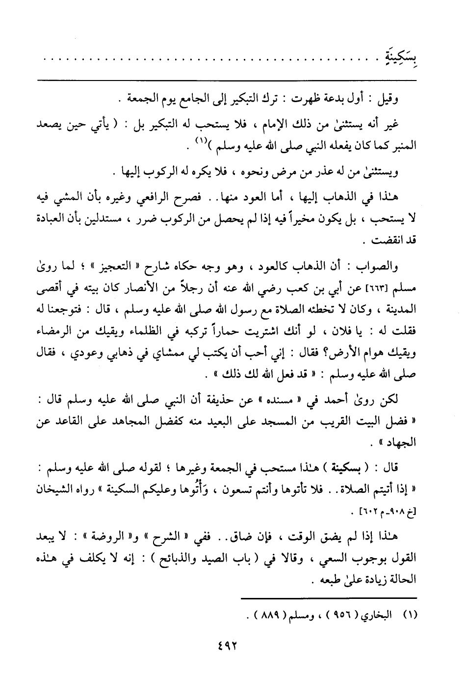 قال: (بسكينة) هذا مستحب في الجمعة وغيرها؛ لقوله صلى الله عليه وسلم: (إذا أتيتم الصلاة .. فلا تأتوها وأنتم تسعون، وأتوها وعليكم السكينة) رواه الشيخان] خ 908 - م 602 [.