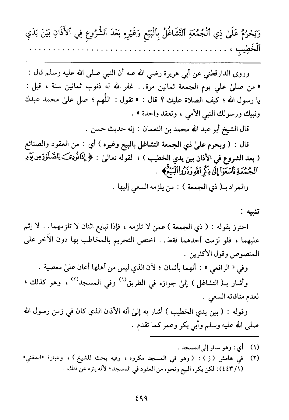 وَيَحْزُمُ عَلَى ذِي الْجُمْعَة التَّشَاغُلُ بِالبَيْعِ وَغَيْرِهِ بَعْدَ الشُّرُوعِ فِي الأَذَانِ بَيْنَ يَدَيِ الْخَطِيبِ،