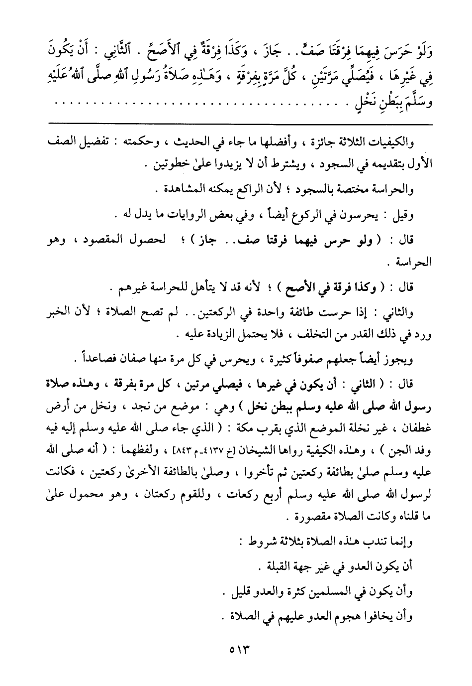 قال: (الثاني: أن يكون في غيرها، فيصلي مرتين، كل مرة بفرقة، وهذه صلاة رسول الله صلى الله عليه وسلم ببطن نخلة) وهي: موضع من نجد، ونخل من أرض غطفان، غير نخلة الموضع الذي بقرب مكة: (الذي جاء صلى الله عليه وسلم إليه فيه وفد الجن)، وهذه الكيفية رواها الشيخان] خ 4137 - م 843 [، ولفظهما: (أنه صلى الله عليه وسلم صلى بطائفة ركعتين ثم تأخروا، وصلى بالطائفة الأخرى ركعتين، فكانت لرسول الله صلى الله عليه وسلم أربع ركعات، وللقوم ركعتان، وهو محمول على ما قلناه وكانت الصلاة مقصورة).