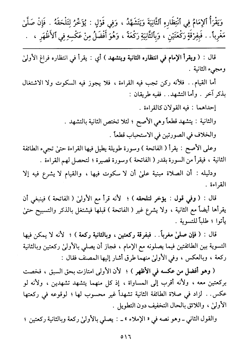 وعلى الأصح: يقرأ (الفاتحة) وسورة طويلة يطيل فيها القراءة حتى تجيء الطائفة الثانية، فيقرأ من السورة بقدر (الفاتحة) وسورة قصيرة؛ لتحصل لهم القراءة.