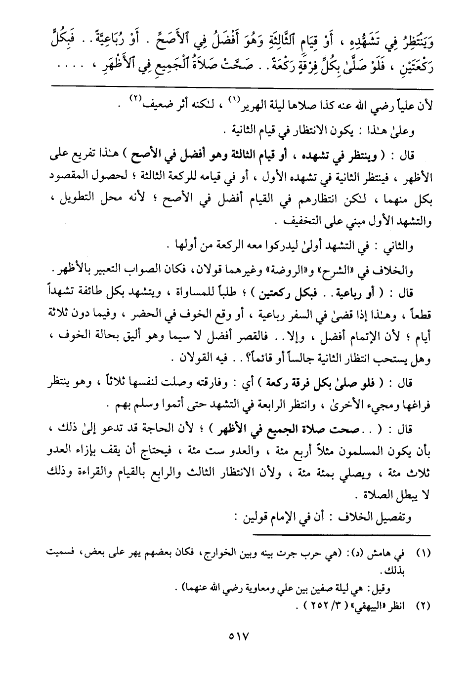 قال: (أو رباعية .. فبكل ركعتين)؛ طلبا للمساواة، ويتشهد بكل طائفة تشهدا قطعا، وهذا إذا قضى في السفر رباعية، أو وقع الخوف في الحضر، وفيما دون ثلاثة أيام؛ لأن الإتمام أفضل، وإلا .. فالقصر أفضل لا سيما وهو أليق بحالة الخوف، وهل يستحب انتظار الثانية جالسا أو قائما؟ .. فيه القولان.