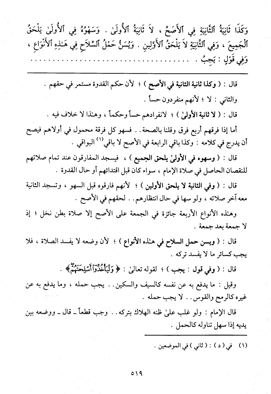 وَكَذّا ثَانِيَةُ الثَّانِيَةِ فِي الأَصَحِّ، لَا ثَانِيَةُ الأُولَى. وَسَهْوُهُ فِي الأُولَى يَلْحَقُ الْجَمِيعَ، وَفِي الثَّانِيَةِ لَا يَلْحَقُ الأَوَّلِينِ. وَيُسَنُّ حَمْلُ السِّلَاحِ فِي هَذِهِ الأَنْوَاعِ، وَفِي قَوْلٍ: يَجِبُ