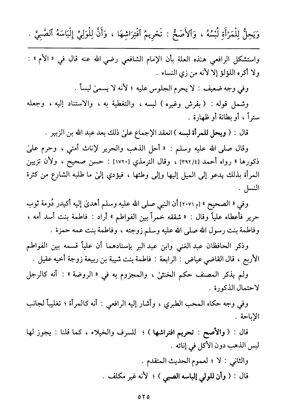 وَيَحِلُّ لِلْمَرْأَةِ لُبْسُهُ، وَالأَصَحُّ: تَحْرِيمُ افْتِرَاشِهَا، وَأَنْ لِلْوَلِيِّ إِلْبَاسَهُ الصَّبِيَّ