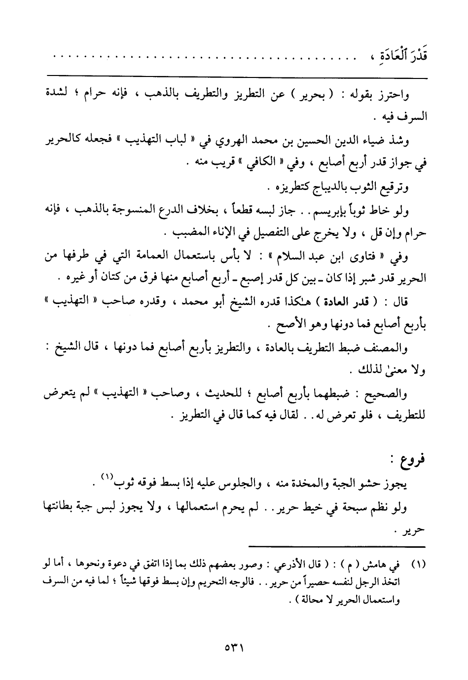 وشذ ضياء الدين الحسين بن محمد الهروي في (لباب التهذيب) فجعله كالحرير في جواز قد أربع أصابع، وفي (الكافي) قريب منه.