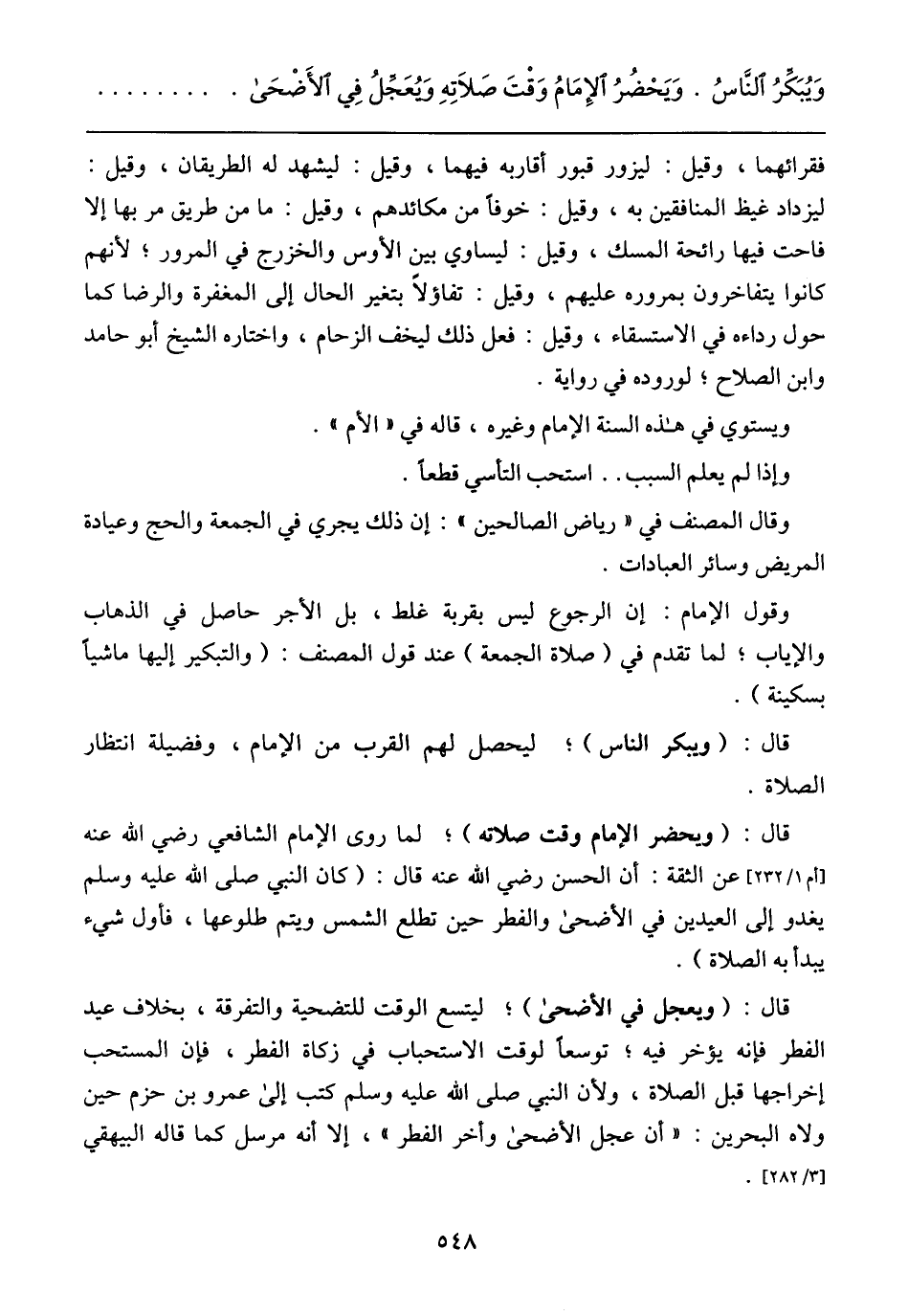 قال: (ويعجل في الأضحى)؛ ليتسع الوقت للتضحية والتفرقة، بخلاف عيد الفطر فإنه يؤخر فيه؛ توسعا لوقت الاستحباب في زكاة الفطر، فإن المستحب إخراجها قبل الصلاة، ولأن النبي صلى الله عليه وسلم كتب إلى عمرو بن حزم حين ولاه البحرين: (أن عجل الأضحى وأخر الفطر)، إلا أنه مرسل كما قاله البيهقي] 3/ 282 [.