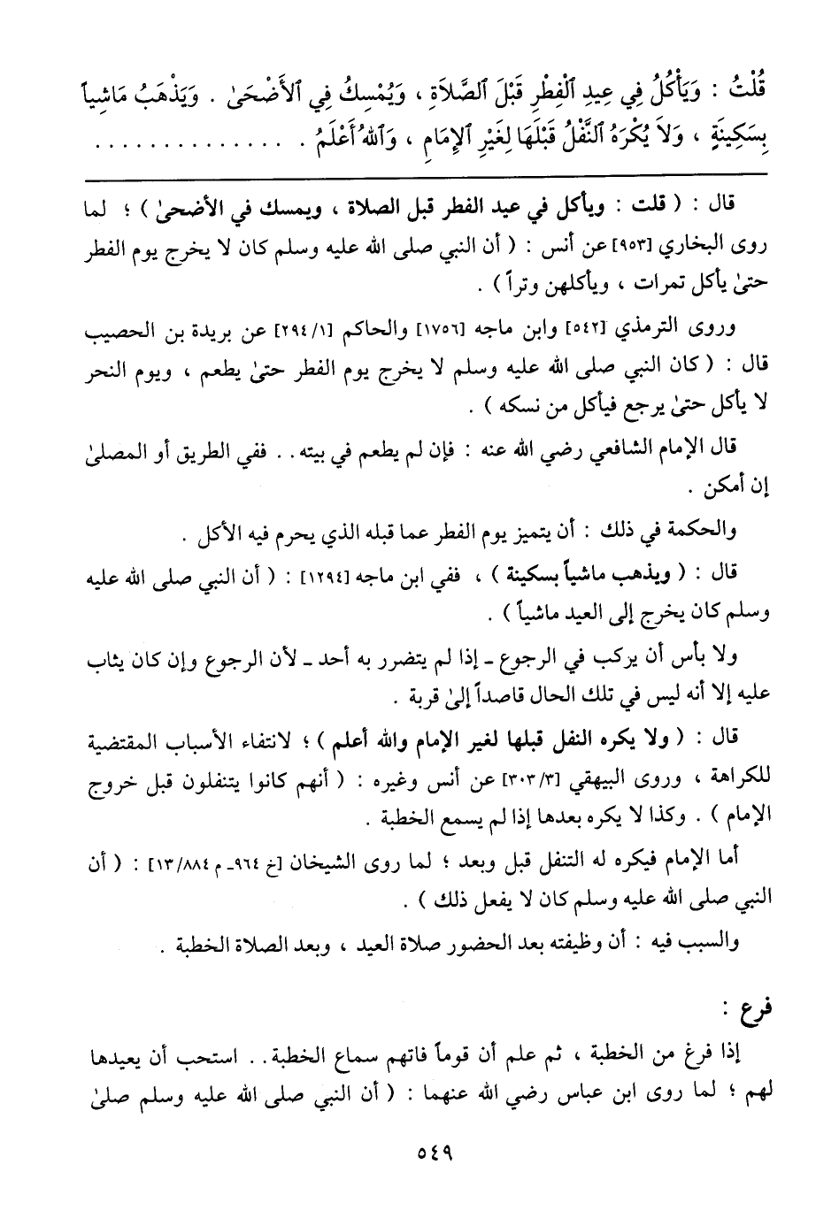 قُلْتُ: وِيَاكُلُ فِي عِيدِ الْفِطْرِ قَبْلَ الصَّلَاةِ، وَيُمْسِكُ فِي الأَضْحَى. وَيَذْهَبُ مَاشِيَاً بِسَكِينَةٍ، وَلَا يُكْرَهُ النَّفْلُ قَبْلَهَا لِغَيْرِ الإِمَامِ، وَاللهُ أَعْلَمُ
