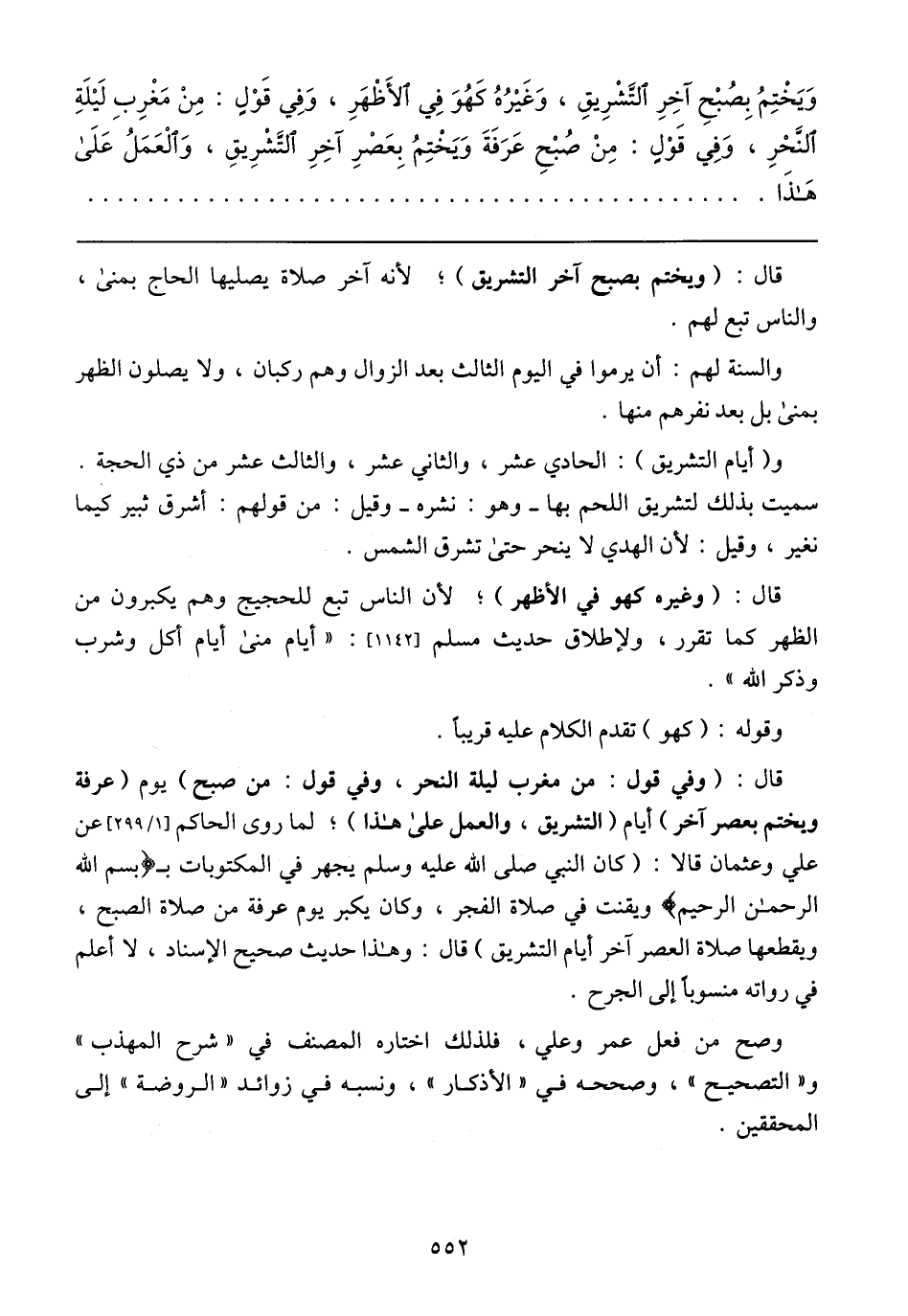 قال: (وفي قول: من مغرب ليلة النحر، وفي قول: من صبح) يوم (عرفة ويختم بعصر آخر) أيام (التشريق، والعمل على هذا)؛ لما روى الحاكم] 1/ 299 [عن علي وعثمان قالا: (كان النبي صلى الله عليه وسلم يجهر في المكتوبات بـ} بسم الله الرحمن الرحيم {ويقنت في صلاة الفجر، وكان يكبر يوم عرفة من صلاة الصبح، ويقطعها صلاة العصر آخر أيام التشريق) قال: وهذا حديث صحيح الإسناد، لا أعلم في رواته منسوبا إلى الجرح.
