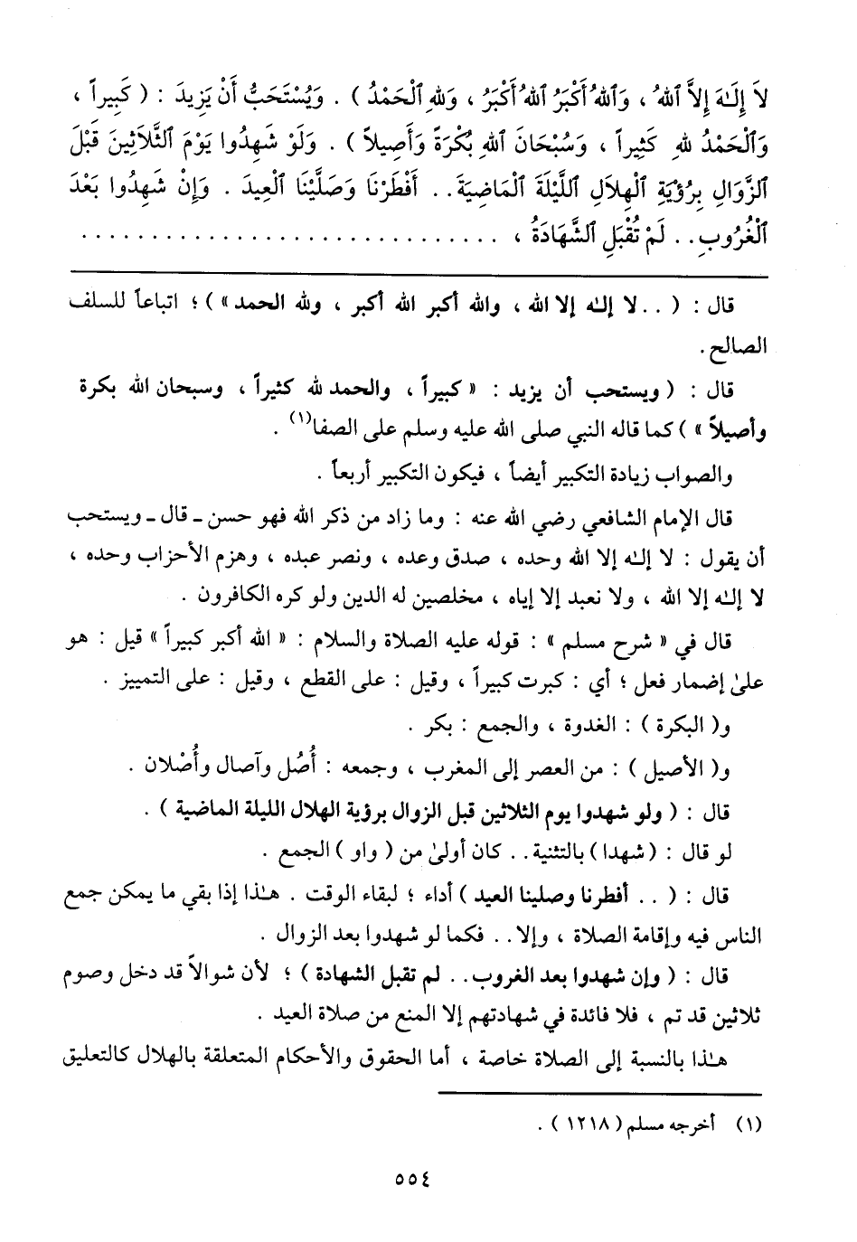 لَا إِلَه إِلَّا اللهُ، وَاللهُ أَكْبَرُ اللهُ أَكْبَرُ، وَللهِ الحَمْدُ). وَيُسْتَحَبُّ أَنْ يَزِيدَ: (كَبِيراً، وَالحَمْدُ للهِ كَثِيراً، وَسُبْحَانَ اللهِ بُكْرَةً وَأَصِيلاً). وَلَوْ شَهِدُوا يَوْمَ الثَّلَاثِينَ قَبْلَ الزَّوَالِ بِرُؤْيَةِ الْهِلَالِ اللَّيْلَةَ الْمَاضِيَةَ .. أَفْطَرْنَا وَصَلَّيْنَا الْعِيدَ. وَإِنْ شَهِدُوا بَعْدَ الْغُرُوبِ .. لَمْ تُقْبَلِ الشَّهَادَةُ،