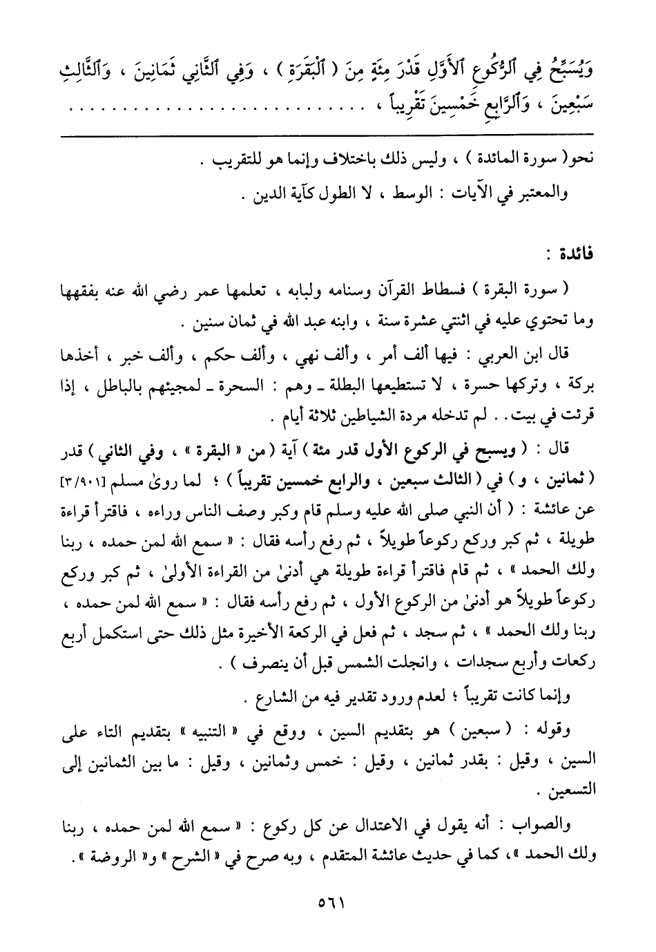 وَيُسَبِّحُ فِي الرُّكوعِ الأَوَّلِ قَدْرَ مِئَةٍ مِنْ (الْبَقَرَةِ)، وَفِي الثَّانِي ثَمَانِينَ، وَالثَّالِثِ سَبْعِينَ، وَالرَّابِعِ خَمْسِينَ تَقْرِيباً،