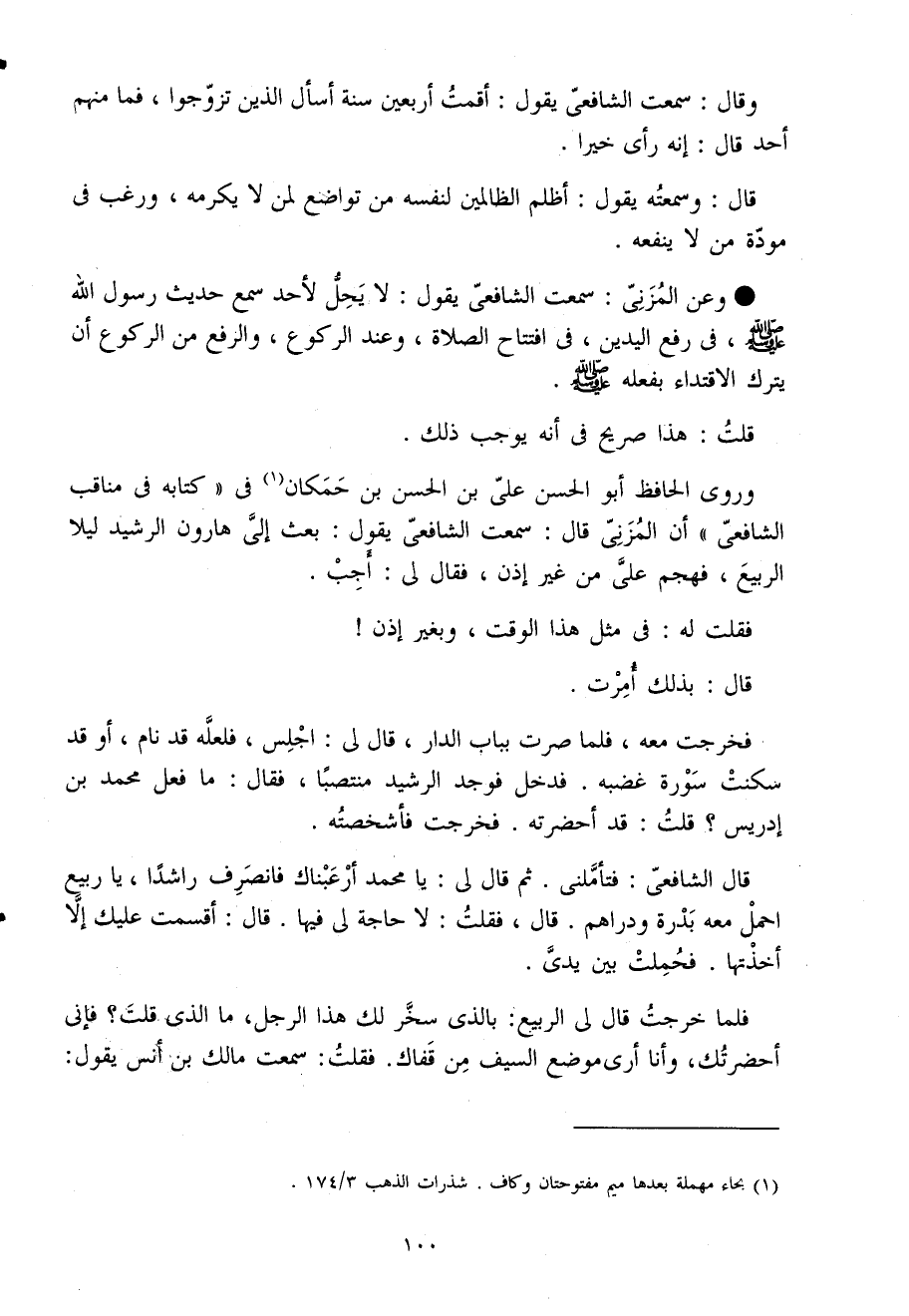 وروى الْحَافِظ أَبُو الْحسن على بن الْحسن بن حمكان فى كِتَابه فى مَنَاقِب الشافعى أَن المزنى قَالَ سَمِعت الشافعى يَقُول بعث إِلَى هَارُون الرشيد لَيْلًا الرّبيع فهجم على من غير إِذن فَقَالَ لى أجب