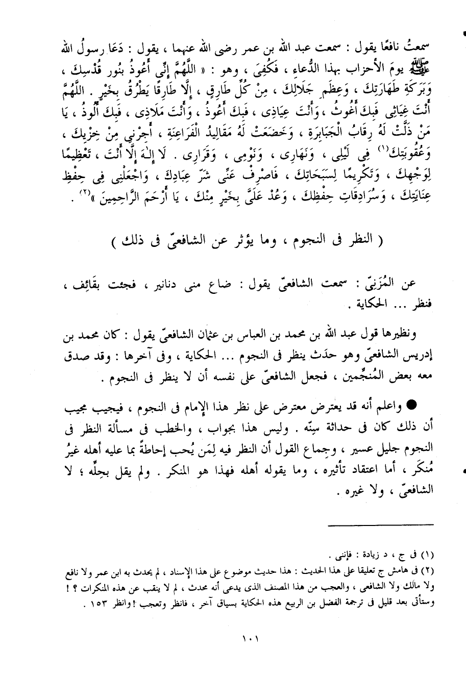 ونظيرها قَول عبد الله بن مُحَمَّد بن الْعَبَّاس بن عُثْمَان الشافعى يَقُول كَانَ مُحَمَّد بن إِدْرِيس الشافعى وَهُوَ حدث ينظر فى النُّجُوم الْحِكَايَة وفى آخرهَا وَقد صدق مَعَه بعض المنجمين فَجعل الشافعى على نَفسه أَن لَا ينظر فى النُّجُوم