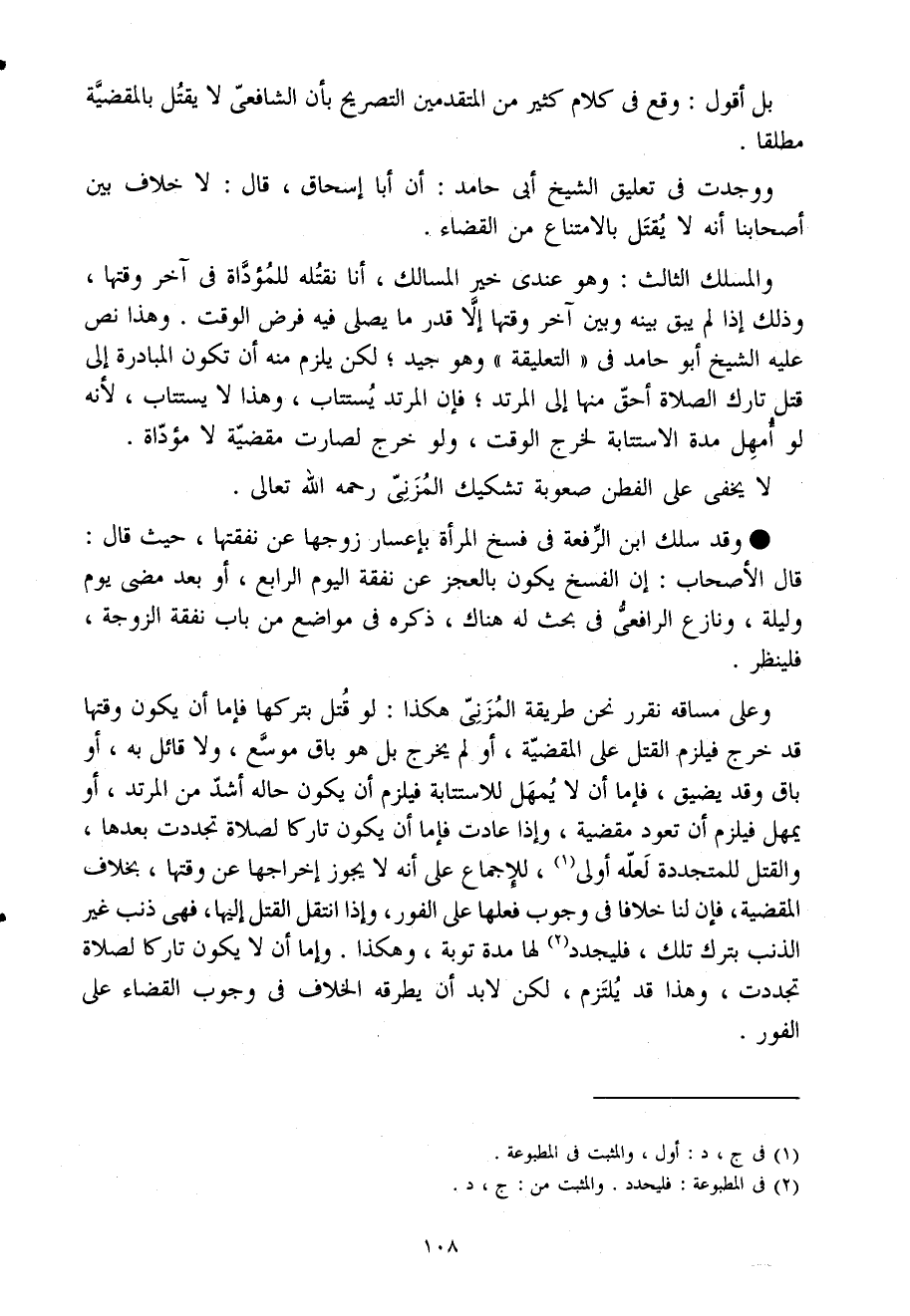 وعَلى مساقة نقرر نَحن طَريقَة المزنى هَكَذَا لَو قتل بِتَرْكِهَا فإمَّا أَن يكون وَقتهَا قد خرج فَيلْزم الْقَتْل على المقضية أَو لم يخرج بل هُوَ بَاقٍ موسع وَلَا قَائِل بِهِ أَو بَاقٍ وَقد يضيق فإمَّا أَن لَا يُمْهل للاستتابة فَيلْزم أَن يكون حَاله أَشد من الْمُرْتَد أَو يُمْهل فَيلْزم أَن تعود مقضية وَإِذا عَادَتْ فإمَّا أَن يكون تَارِكًا لصَلَاة تَجَدَّدَتْ بعْدهَا وَالْقَتْل للمتجددة لَعَلَّه أولى للْإِجْمَاع على أَنه لَا يجوز إخْرَاجهَا عَن وَقتهَا بِخِلَاف المقضية فَإِن لنا خلافًا فى وجوب فعلهَا على الْفَوْر وَإِذا انْتقل الْقَتْل إِلَيْهَا فهى ذَنْب غير الذَّنب بترك تِلْكَ فليجدد لَهَا مُدَّة تَوْبَة وَهَكَذَا وَإِمَّا أَن لَا يكون تَارِكًا لصَلَاة تَجَدَّدَتْ وَهَذَا قد يلْتَزم لَكِن لَا بُد أَن يطرقه الْخلاف فى وجوب الْقَضَاء على الْفَوْر
