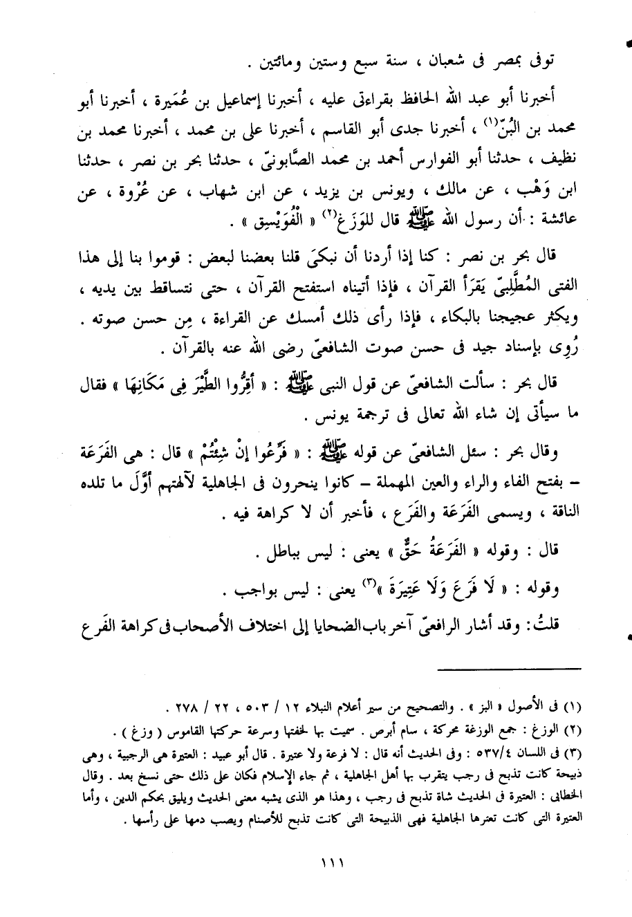 وَقَالَ بَحر سُئِلَ الشافعى عَن قَوْله صلى الله عَلَيْهِ وَسلم فرعوا إِن شِئْتُم قَالَ هى الفرعة بِفَتْح الْفَاء وَالرَّاء وَالْعين الْمُهْملَة كَانُوا ينحرون فى الْجَاهِلِيَّة لآلهتهم أول مَا تلده النَّاقة وَيُسمى الفرعة وَالْفرع فَأخْبر أَن لَا كَرَاهَة فِيهِ