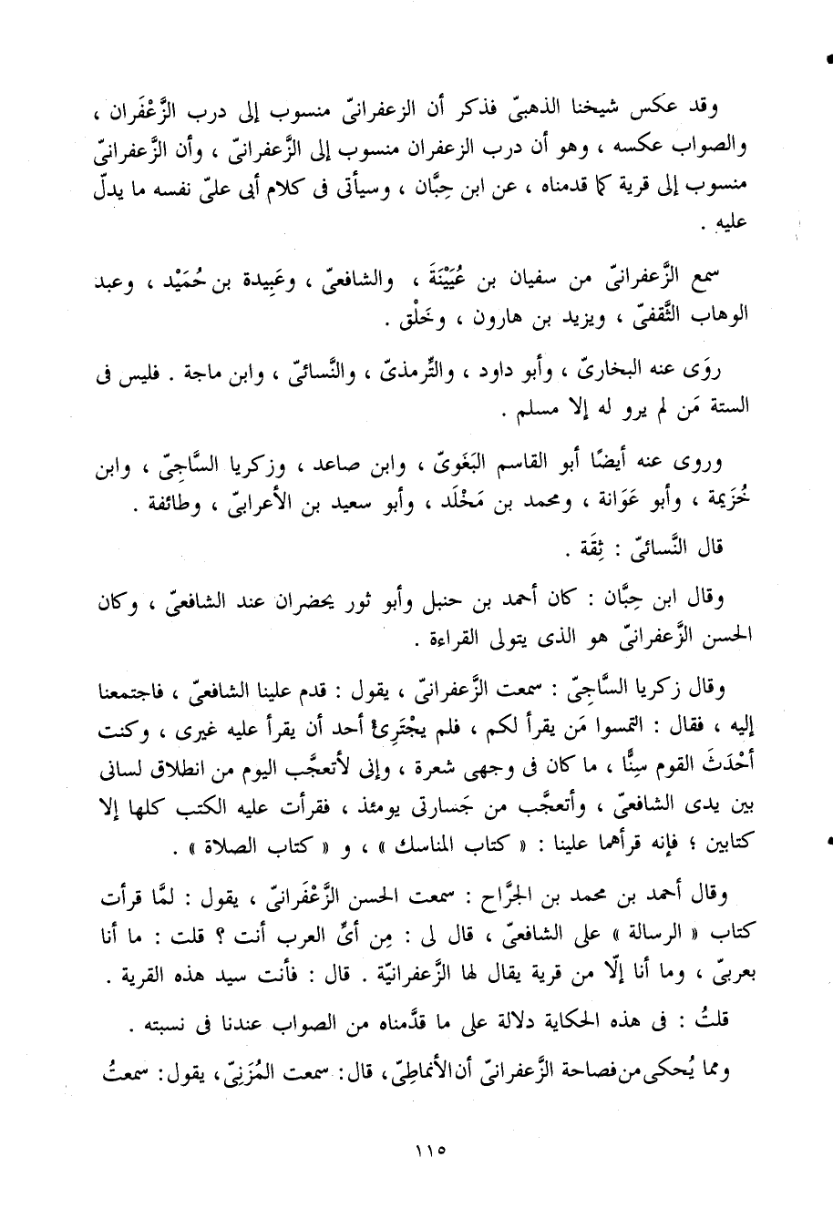وَقَالَ أَحْمد بن مُحَمَّد بن الْجراح سَمِعت الْحسن الزعفرانى يَقُول لما قَرَأت كتاب الرسَالَة على الشافعى قَالَ لى من أَي الْعَرَب أَنْت قلت مَا أَنا بعربى وَمَا أَنا إِلَّا من قَرْيَة يُقَال لَهَا الزعفرانية قَالَ فَأَنت سيد هَذِه الْقرْيَة