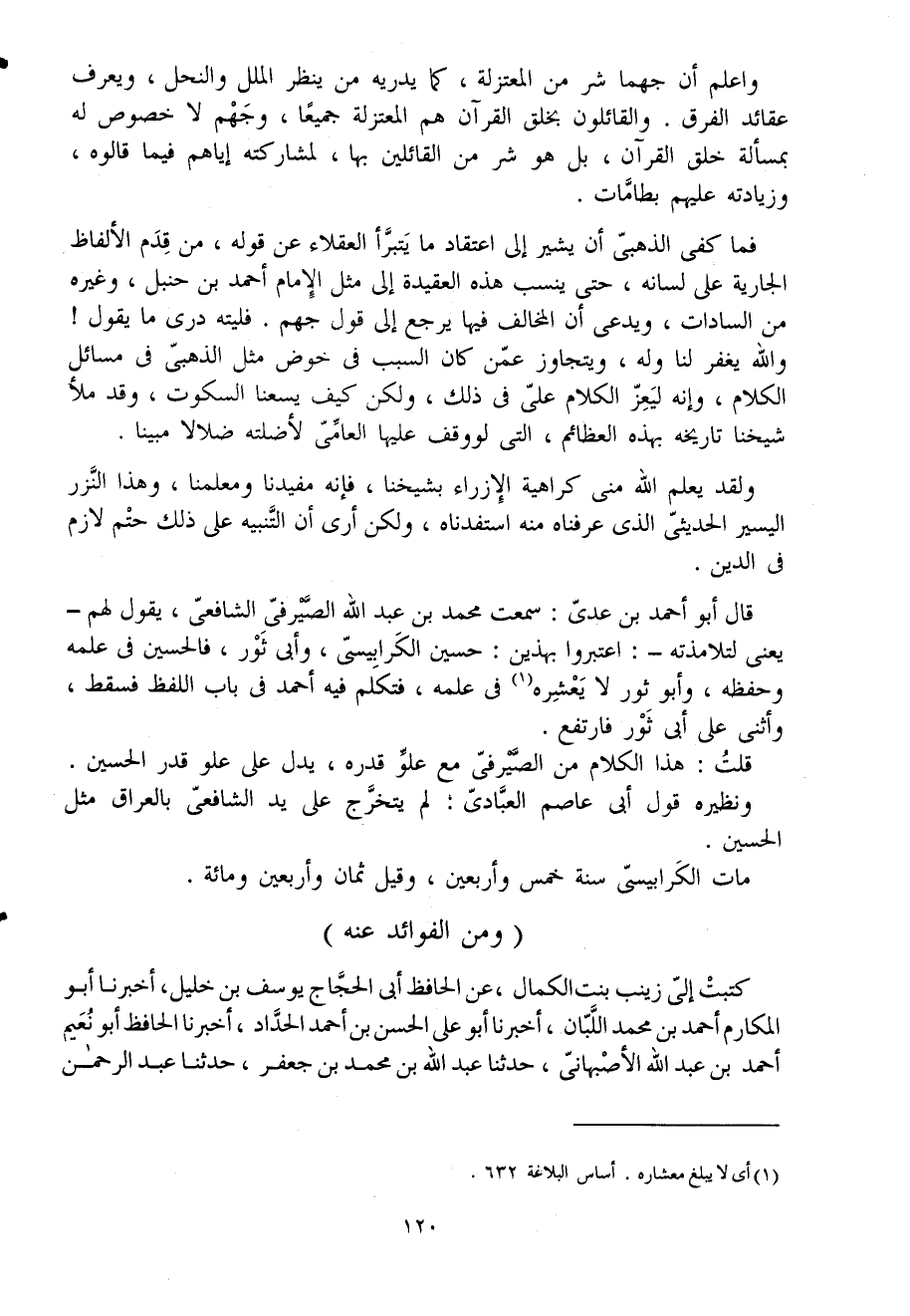 فَمَا كفى الذهبى أَن يُشِير إِلَى اعْتِقَاد مَا يتبرأ الْعُقَلَاء عَن قَوْله من قدم الْأَلْفَاظ الْجَارِيَة على لِسَانه حَتَّى ينْسب هَذِه العقيدة إِلَى مثل الإِمَام أَحْمد بن حَنْبَل وَغَيره من السادات ويدعى أَن الْمُخَالف فِيهَا يرجع إِلَى قَول جهم فليته درى مَا يَقُول وَالله يغْفر لنا وَله ويتجاوز عَمَّن كَانَ السَّبَب فى خوض مثل الذهبى فى مسَائِل الْكَلَام وَإنَّهُ ليعز الْكَلَام على فى ذَلِك وَلَكِن كَيفَ يسعنا السُّكُوت وَقد مَلأ شَيخنَا تَارِيخه بِهَذِهِ العظائم الَّتِى لَو وقف عَلَيْهَا العامى لأضلته ضلالا مُبينًا