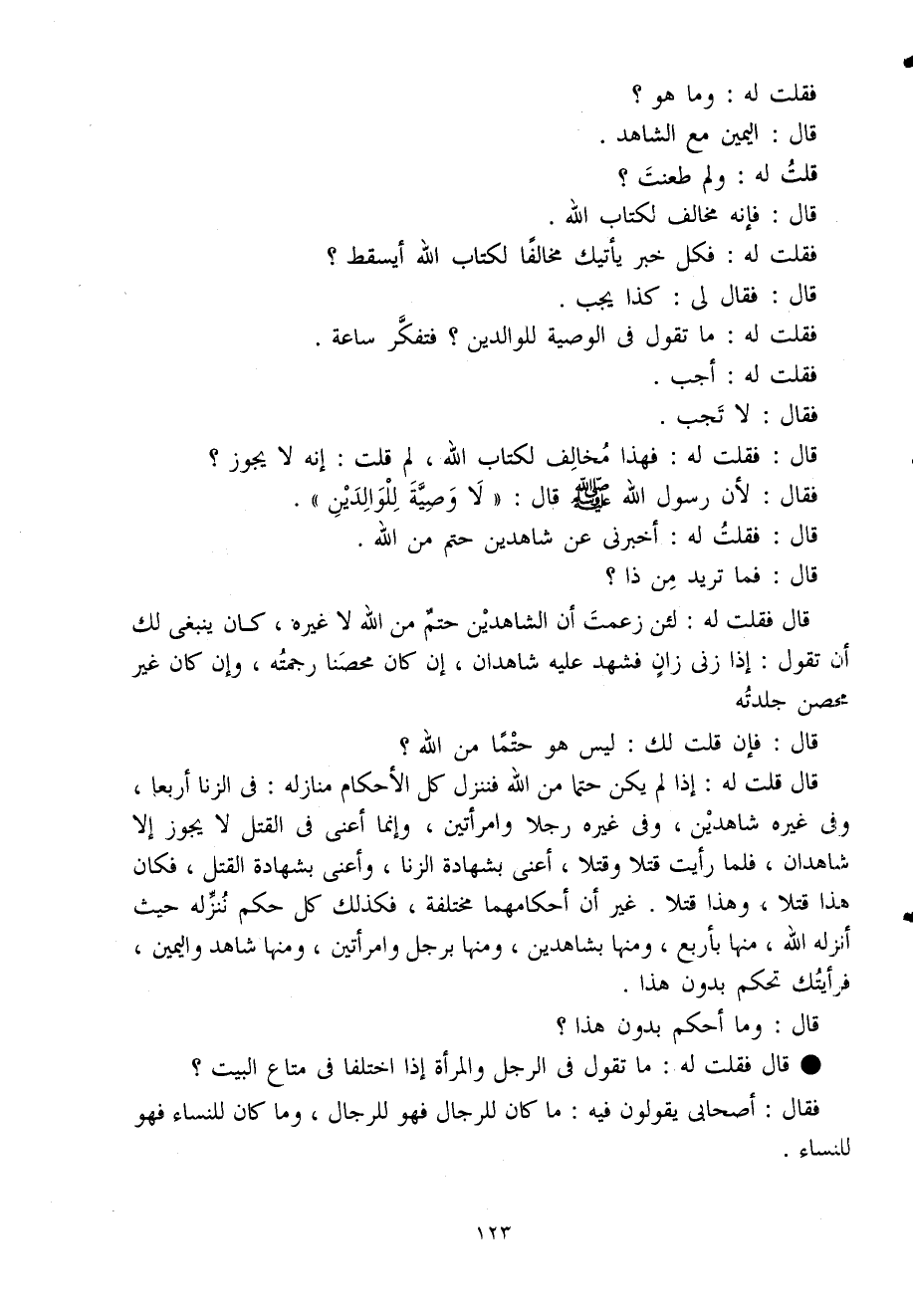 قَالَ فَقلت لَهُ أخبرنى عَن شَاهِدين حتم من الله قَالَ فَمَا تُرِيدُ من ذَا قَالَ فَقلت لَهُ لَئِن زعمت أَن الشَّاهِدين حتم من الله لَا غَيره كَانَ ينبغى لَك أَن تَقول إِذا زنى زَان فَشهد عَلَيْهِ شَاهِدَانِ إِن كَانَ مُحصنا رَجَمْته وَإِن كَانَ غير مُحصن جلدته قَالَ فَإِن قلت لَك لَيْسَ هُوَ حتما من الله قَالَ قلت لَهُ إِذا لم يكن حتما من الله فَنَنْزِل كل الْأَحْكَام مَنَازِله فى الزِّنَا أَرْبعا وفى غَيره شَاهِدين وفى غَيره رجلا وَامْرَأَتَيْنِ وَإِنَّمَا أعنى فى الْقَتْل لَا يجوز إِلَّا شَاهِدَانِ فَلَمَّا رَأَيْت قتلا وقتلا أعنى بِشَهَادَة الزِّنَا وأعنى بِشَهَادَة الْقَتْل فَكَانَ هَذَا قتلا وَهَذَا قتلا غير أَن أحكامهما مُخْتَلفَة فَكَذَلِك كل حكم ننزله حَيْثُ أنزلهُ الله مِنْهَا بِأَرْبَع وَمِنْهَا بِشَاهِدين وَمِنْهَا بِرَجُل وَامْرَأَتَيْنِ وَمِنْهَا شَاهد وَالْيَمِين فرأيتك تحكم بِدُونِ هَذَا