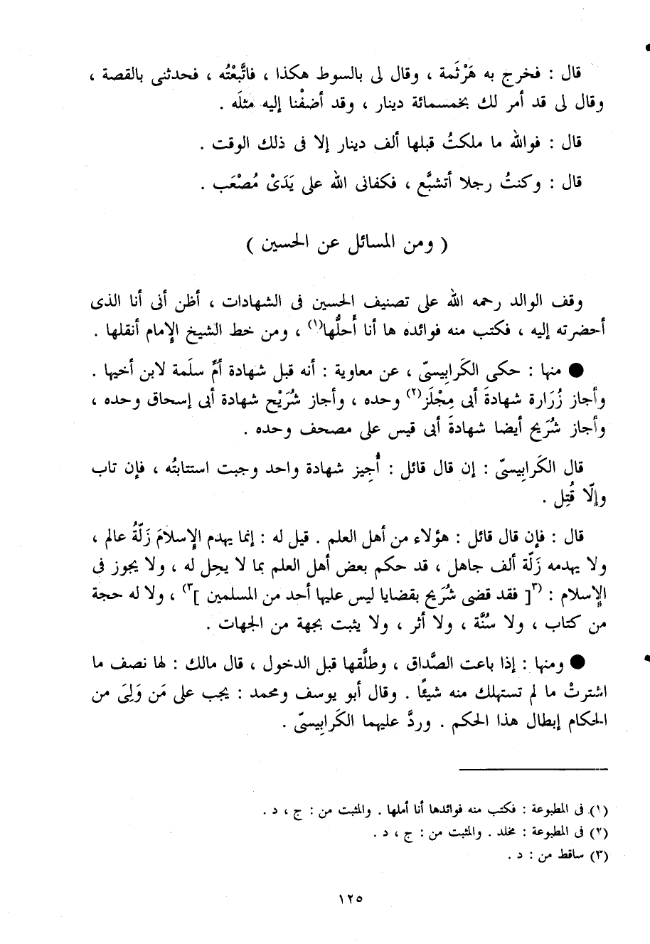 وقف الْوَالِد رَحمَه الله على تصنيف الْحُسَيْن فى الشَّهَادَات أَظن أَنى أَنا الذى أحضرته إِلَيْهِ فَكتب مِنْهُ فَوَائده هَا أَنا أحلهَا وَمن خطّ الشَّيْخ الإِمَام أنقلها
