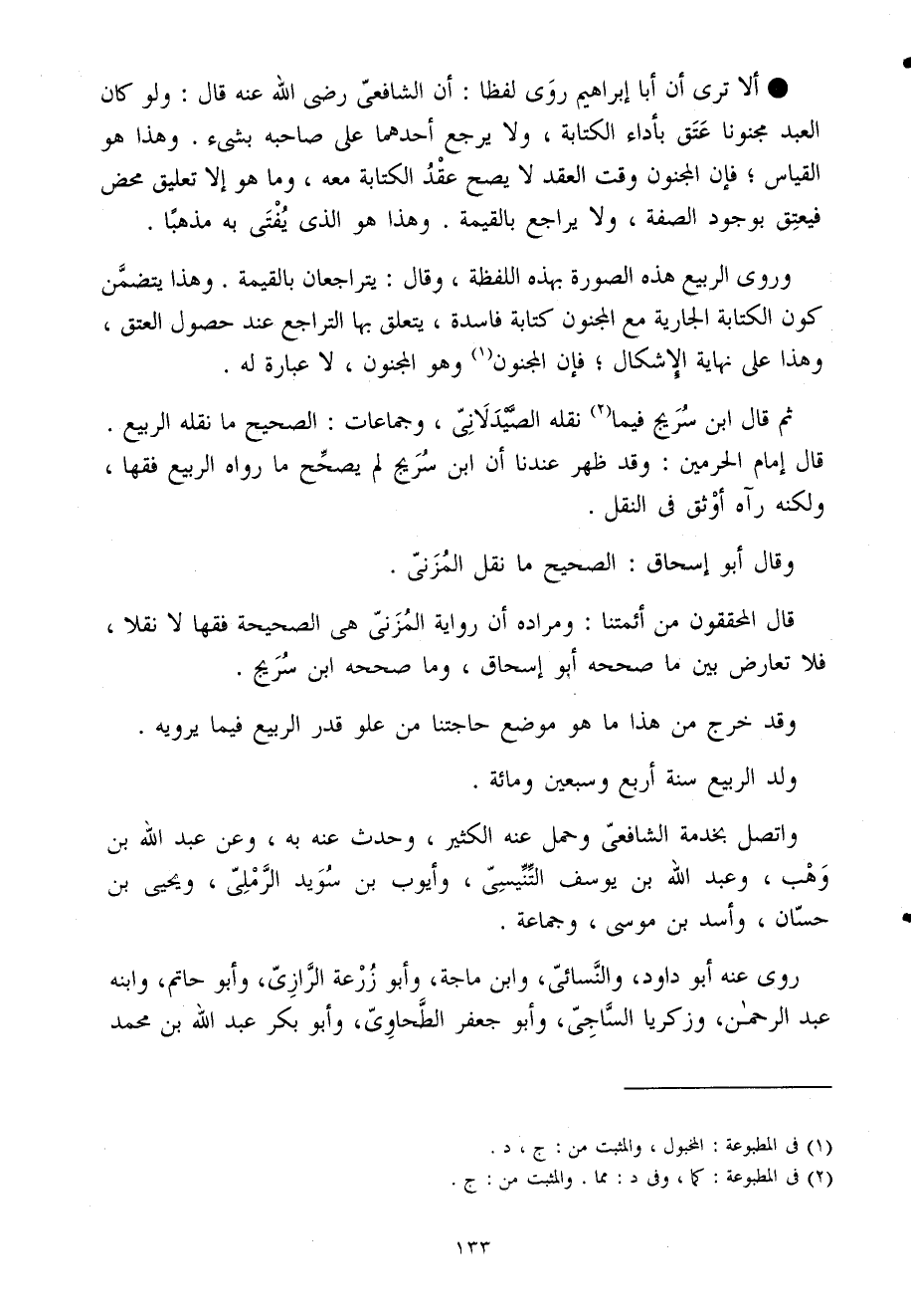 ثمَّ قَالَ ابْن سُرَيج فِيمَا نَقله الصيدلانى وجماعات الصَّحِيح مَا نَقله الرّبيع قَالَ إِمَام الْحَرَمَيْنِ وَقد ظهر عندنَا أَن ابْن سُرَيج لم يصحح مَا رَوَاهُ الرّبيع فقها وَلكنه رَآهُ أوثق فى النَّقْل
