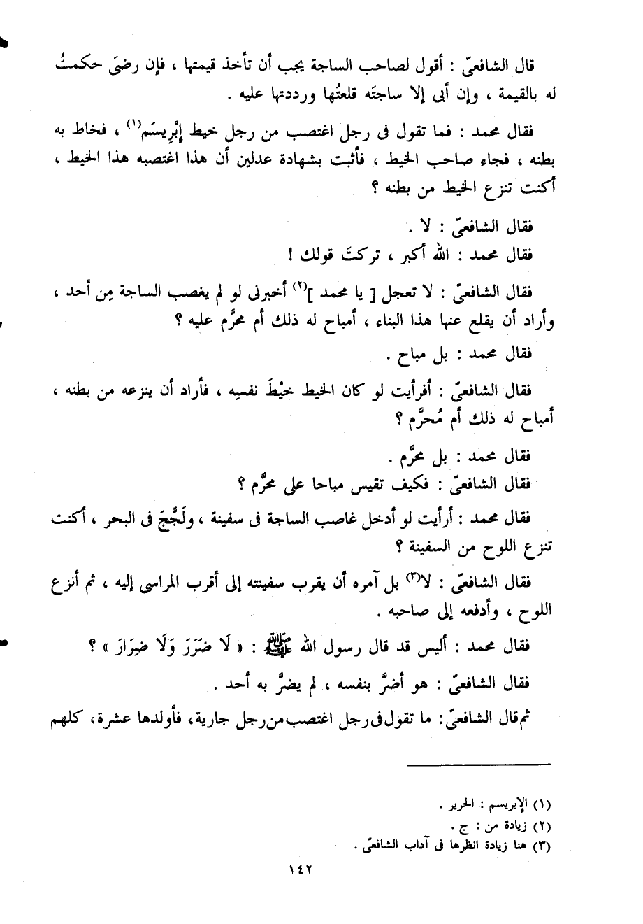 فَقَالَ مُحَمَّد الله أكبر تركت قَوْلك فَقَالَ الشافعى لَا تعجل يَا مُحَمَّد أخبرنى لَو لم يغصب الساجة من أحد وَأَرَادَ أَن يقْلع عَنْهَا هَذَا الْبناء أمباح لَهُ ذَلِك أم محرم عَلَيْهِ فَقَالَ مُحَمَّد بل مُبَاح