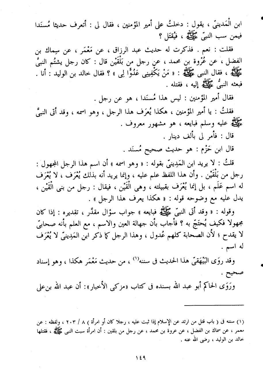 ابْن المدينى يَقُول دخلت على أَمِير الْمُؤمنِينَ فَقَالَ لى أتعرف حَدِيثا مُسْندًا فِيمَن سبّ النبى صلى الله عَلَيْهِ وَسلم فَيقْتل فَقلت نعم فَذكرت لَهُ حَدِيث عبد الرَّزَّاق عَن معمر عَن سماك بن الْفضل عَن عُرْوَة بن مُحَمَّد عَن رجل من بلقين قَالَ كَانَ رجل يشْتم النبى صلى الله عَلَيْهِ وَسلم فَقَالَ النبى صلى الله عَلَيْهِ وَسلم (من يكفينى عدوا لى) فَقَالَ خَالِد بن الْوَلِيد أَنا فَبَعثه النبى صلى الله عَلَيْهِ وَسلم إِلَيْهِ فَقتله