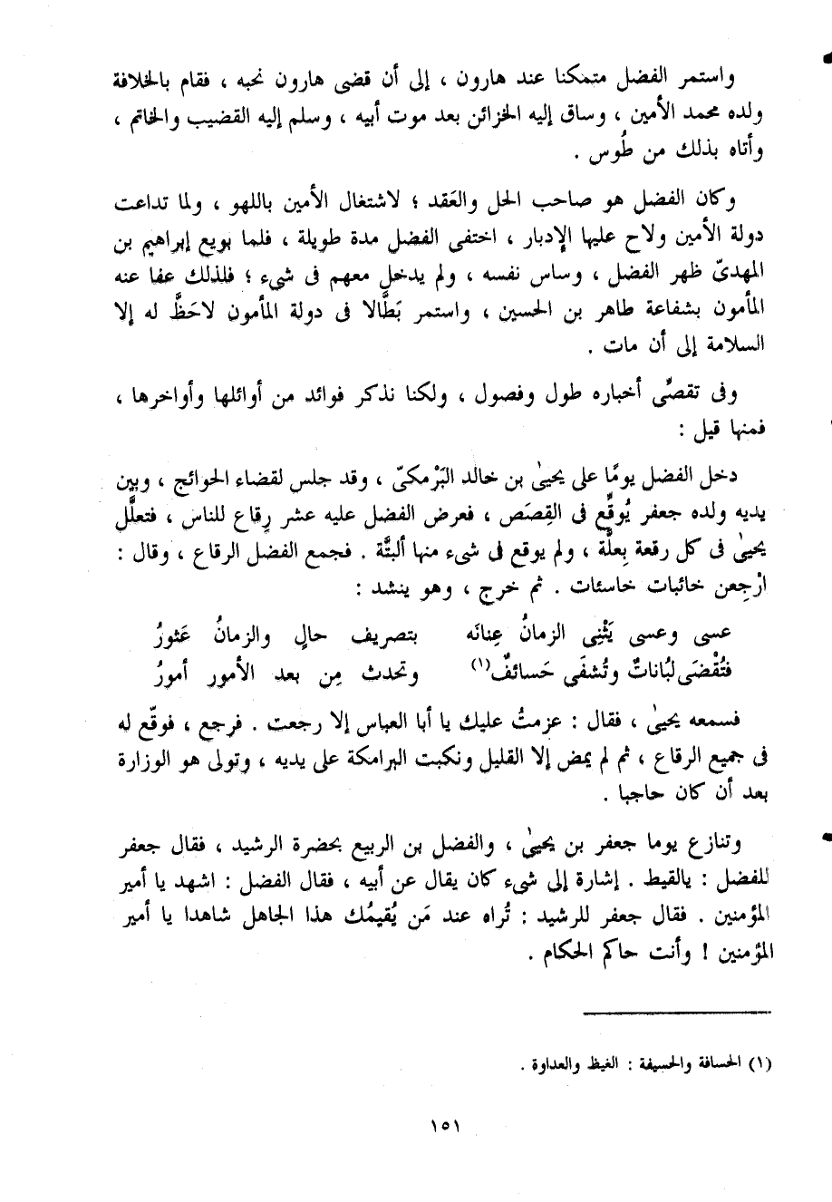 وفى تقصى أخباره طول وفصول وَلَكنَّا نذْكر فَوَائِد من أوائلها وأواخرها فَمِنْهَا قيل دخل الْفضل يَوْمًا على يحيى بن خَالِد البرمكى وَقد جلس لقَضَاء الْحَوَائِج وَبَين يَدَيْهِ وَلَده جَعْفَر يُوقع فى الْقَصَص فَعرض الْفضل عَلَيْهِ عشر رقاع للنَّاس فتعلل يحيى فى كل رقْعَة بعلة وَلم يُوقع فى شئ مِنْهَا أَلْبَتَّة فَجمع الْفضل الرّقاع وَقَالَ ارْجِعْنَ خائبات خاسئات ثمَّ خرج وَهُوَ ينشد