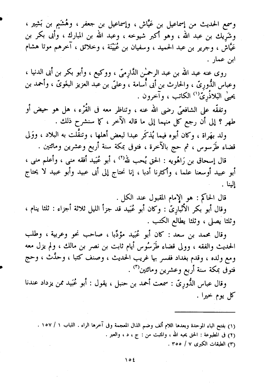 وَقَالَ أَبُو بكر الأنبارى وَكَانَ أَبُو عبيد قد جزأ اللَّيْل ثَلَاثَة أَجزَاء ثلثا ينَام وَثلثا يصلى وَثلثا يطالع الْكتب