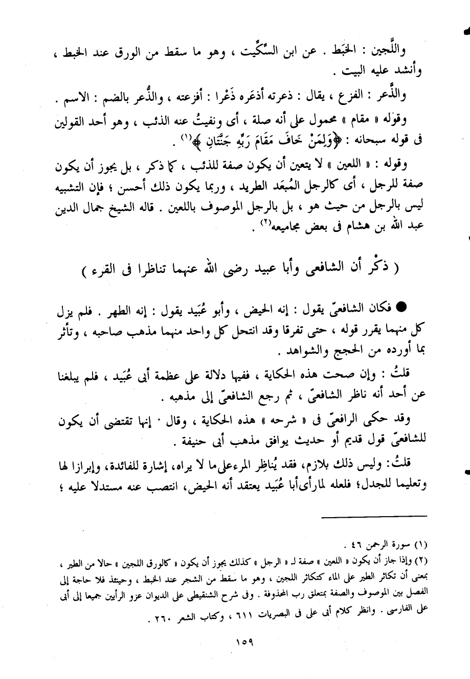 فَكَانَ الشافعى يَقُول إِنَّه الْحيض وَأَبُو عبيد يَقُول إِنَّه الطُّهْر فَلم يزل كل مِنْهُمَا يُقرر قَوْله حَتَّى تفَرقا وَقد انتحل كل وَاحِد مِنْهُمَا مَذْهَب صَاحبه وتأثر بِمَا أوردهُ من الْحجَج والشواهد