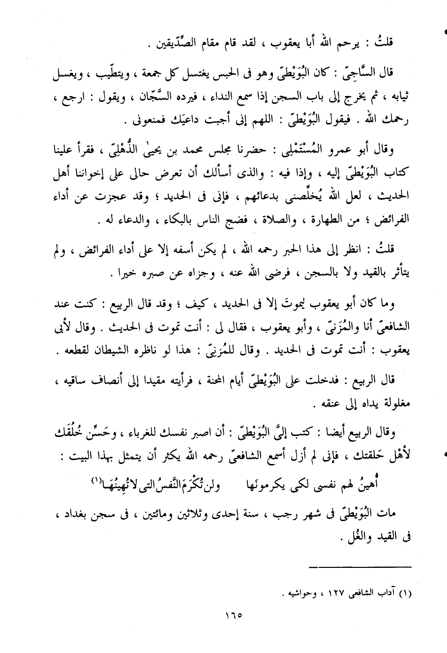 قَالَ الساجى كَانَ البويطى وَهُوَ فى الْحَبْس يغْتَسل كل جُمُعَة ويتطيب وَيغسل ثِيَابه ثمَّ يخرج إِلَى بَاب السجْن إِذا سمع النداء فَيردهُ السجان وَيَقُول ارْجع رَحِمك الله فَيَقُول البويطى اللَّهُمَّ إنى أجبْت داعيك فمنعونى