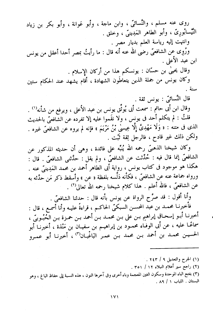 وَقَالَ ابْن أَبى حَاتِم سَمِعت أَبى يوثق يُونُس بن عبد الْأَعْلَى وَيرْفَع من شَأْنه قلت لم يتَكَلَّم أحد فى يُونُس وَلَا نقموا عَلَيْهِ إِلَّا تفرده عَن الشافعى بِالْحَدِيثِ الذى فى مَتنه وَلَا مهدى إِلَّا عِيسَى بن مَرْيَم فَإِنَّهُ لم يروه عَن الشافعى غَيره وَلَكِن ذَلِك غير قَادِح فالرجل ثِقَة ثَبت