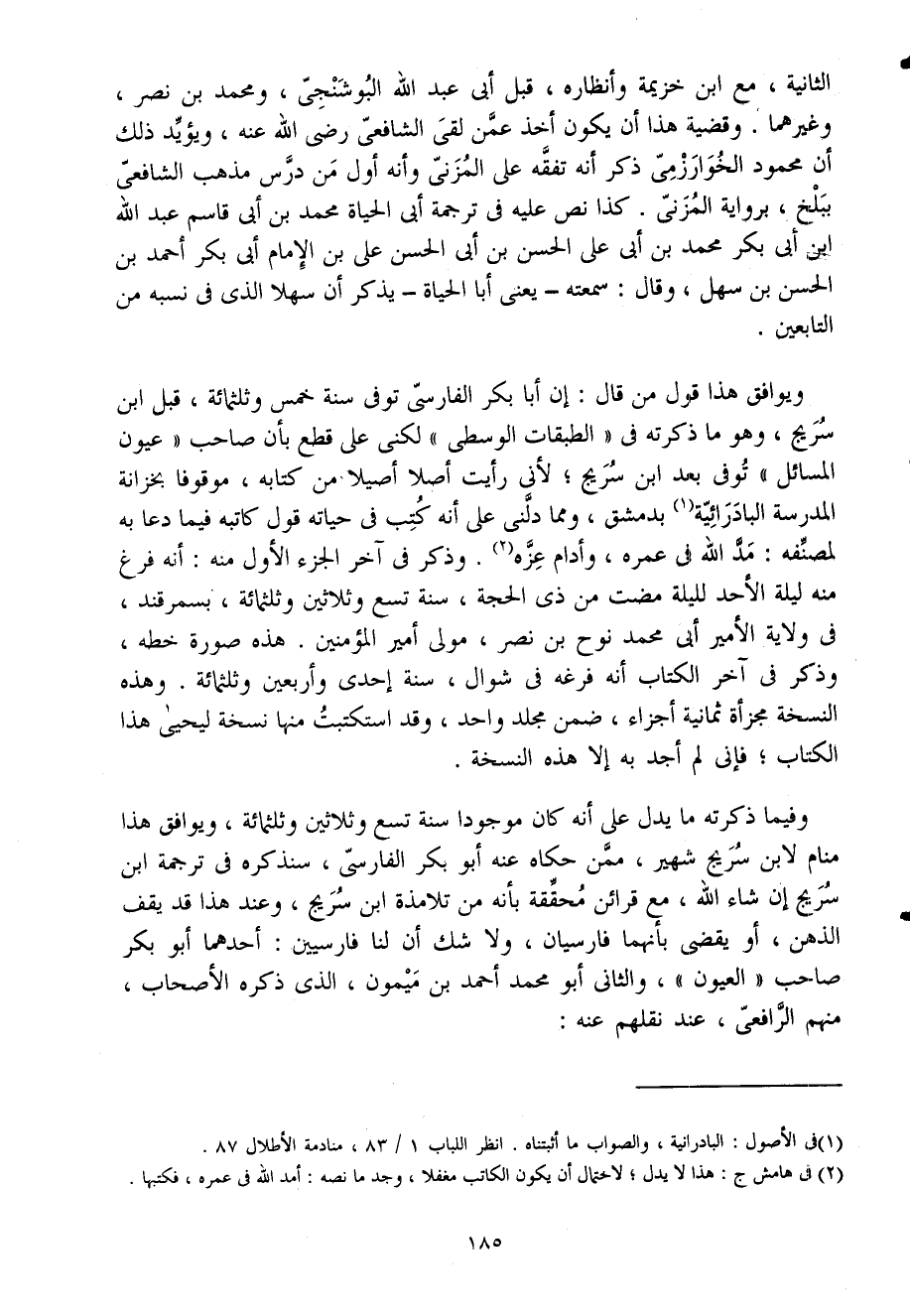 ويوافق هَذَا قَول من قَالَ إِن أَبَا بكر الفارسى توفى سنة خمس وثلثمائة قبل ابْن سُرَيج وَهُوَ مَا ذكرته فى الطَّبَقَات الْوُسْطَى لكنى على قطع بِأَن صَاحب عُيُون الْمسَائِل توفى بعد ابْن سُرَيج لأنى رَأَيْت أصلا أصيلا من كِتَابه مَوْقُوفا بخزانة الْمدرسَة البادرائية بِدِمَشْق وَمِمَّا دلنى على أَنه كتب فى حَيَاته قَول كَاتبه فِيمَا دَعَا بِهِ لمصنفه مد الله فى عمره وأدام عزه وَذكر فى آخر الْجُزْء الأول مِنْهُ أَنه فرغ مِنْهُ لَيْلَة الْأَحَد لليلة مَضَت من ذى الْحجَّة سنة تسع وَثَلَاثِينَ وثلثمائة بسمرقند فى ولَايَة الْأَمِير أَبى مُحَمَّد نوح بن نصر مولى أَمِير الْمُؤمنِينَ هَذِه صُورَة خطه وَذكر فى آخر الْكتاب أَنه فرغه فى شَوَّال سنة إِحْدَى وَأَرْبَعين وثلثمائة وَهَذِه النُّسْخَة مجزأَة ثَمَانِيَة أَجزَاء ضمن مُجَلد وَاحِد وَقد استكتبت مِنْهَا نُسْخَة ليحيى هَذَا الْكتاب فإنى لم أجد بِهِ إِلَّا هَذِه النُّسْخَة