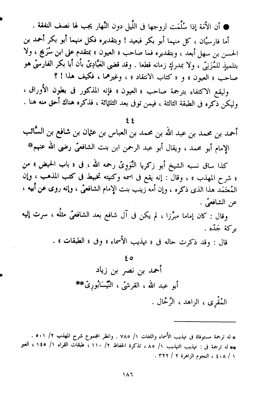 أما فارسيان كل مِنْهُمَا أَبُو بكر فبعيد وبتقديره فَكل مِنْهُمَا أَبُو بكر أَحْمد بن الْحسن بن سهل أبعد وبتقديره فَمَا صَاحب الْعُيُون بمتقدم على ابْن سُرَيج وَلَا بتلميذ للمزنى وَلَا بمدرك زَمَانه قطعا وَقد قضى العبادى بِأَن أَبَا بكر الفارسى هُوَ صَاحب الْعُيُون وَكتاب الانتقاد وَغَيرهمَا فَكيف هَذَا وليقع الِاكْتِفَاء بترجمة صَاحب الْعُيُون فَإِنَّهُ الْمَذْكُور فى بطُون الأوراق وَليكن ذكره فى الطَّبَقَة الثَّالِثَة فِيمَن توفى بعد الثلثمائة فَذكره هُنَاكَ أَحَق مِنْهُ هُنَا