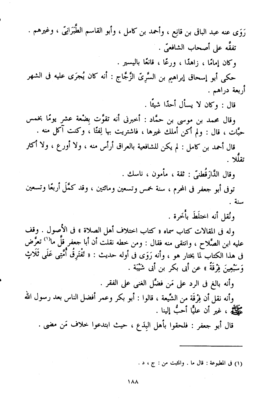 قَالَ أَحْمد بن كَامِل لم يكن للشَّافِعِيَّة بالعراق أرأس مِنْهُ وَلَا أورع وَلَا أَكثر تقللا
