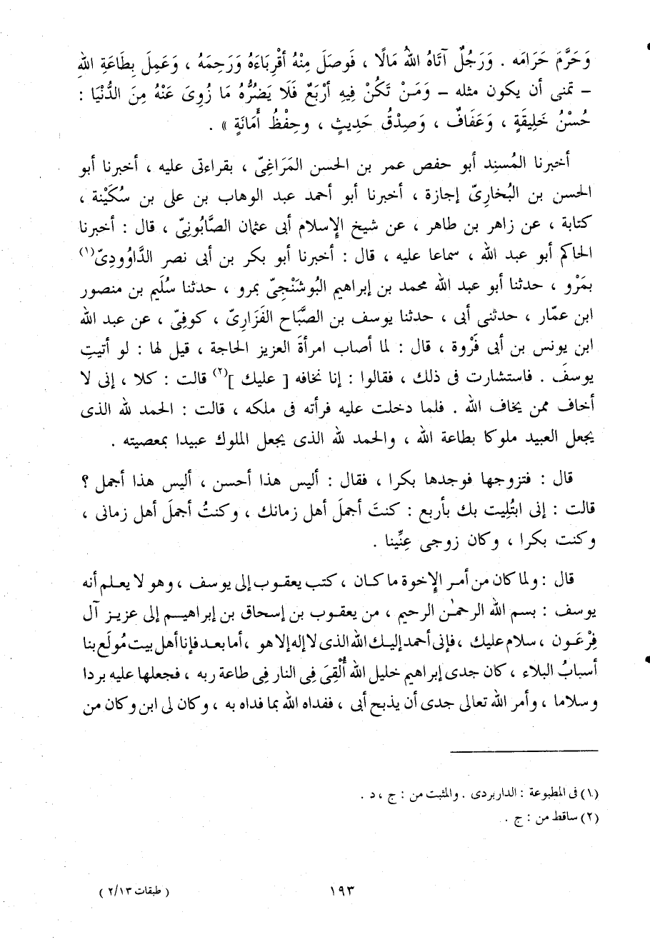 أخبرنَا الْمسند أَبُو حَفْص عمر بن الْحسن المراغى بقراءتى عَلَيْهِ أخبرنَا أَبُو الْحسن بن البخارى إجَازَة أخبرنَا أَبُو أَحْمد عبد الْوَهَّاب بن على بن سكينَة كِتَابَة عَن زَاهِر بن طَاهِر عَن شيخ الْإِسْلَام أَبى عُثْمَان الصابونى قَالَ أخبرنَا الْحَاكِم أَبُو عبد الله سَمَاعا عَلَيْهِ قَالَ أخبرنَا أَبُو بكر بن أَبى نصر الداوودى بمرو حَدثنَا أَبُو عبد الله مُحَمَّد بن إِبْرَاهِيم البوشنجى بمرو حَدثنَا سليم بن مَنْصُور ابْن عمار حَدثنِي أَبى حَدثنَا يُوسُف بن الصَّباح الفزارى كوفى عَن عبد الله ابْن يُونُس بن أَبى فَرْوَة قَالَ لما أصَاب امْرَأَة الْعَزِيز الْحَاجة قيل لَهَا لَو أتيت يُوسُف فاستشارت فى ذَلِك فَقَالُوا إِنَّا نخافه عَلَيْك قَالَت كلا إنى لَا أَخَاف مِمَّن يخَاف الله فَلَمَّا دخلت عَلَيْهِ فرأته فى ملكه قَالَت الْحَمد لله الذى يَجْعَل العبيد ملوكا بِطَاعَة الله وَالْحَمْد لله الذى يَجْعَل الْمُلُوك عبيدا بمعصيته