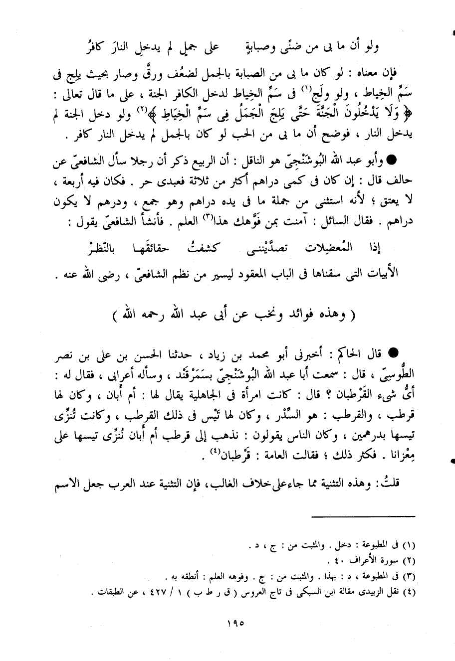 وَأَبُو عبد الله البوشنجى هُوَ النَّاقِل أَن الرّبيع ذكر أَن رجلا سَأَلَ الشافعى عَن حَالف قَالَ إِن كَانَ فى كمى دَرَاهِم أَكثر من ثَلَاثَة فعبدى حر فَكَانَ فِيهِ أَرْبَعَة لَا يعْتق لِأَنَّهُ اسْتثْنى من جملَة مَا فى يَده دَرَاهِم وَهُوَ جمع وَدِرْهَم لَا يكون دَرَاهِم فَقَالَ السَّائِل آمَنت بِمن فوهك هَذَا الْعلم فَأَنْشَأَ الشافعى يَقُول