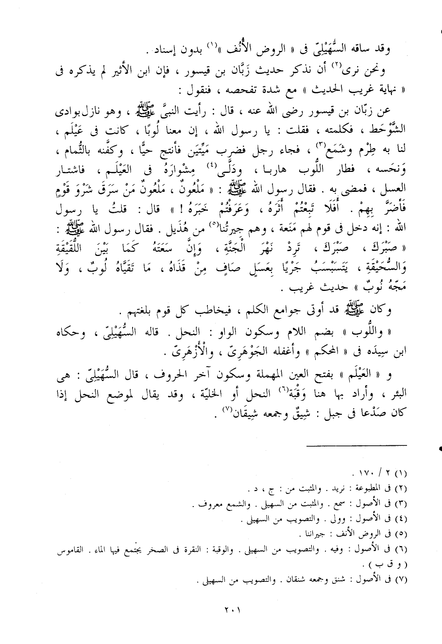عَن زبان بن قيسور رضى الله عَنهُ قَالَ رَأَيْت النبى صلى الله عَلَيْهِ وَسلم وَهُوَ نَازل بوادى الشوحط فكلمته فَقلت يَا رَسُول الله إِن مَعنا لوبا كَانَت فى عيلم لنا بِهِ طرم وشمع فجَاء رجل فَضرب ميتين فأنتج حَيا وكفنه بالثمام ونحسه فطار اللوب هَارِبا ودلى مشواره فى العيلم فاشتار الْعَسَل فَمضى بِهِ فَقَالَ رَسُول الله صلى الله عَلَيْهِ وَسلم (مَلْعُون مَلْعُون من سرق شرو قوم فأضر بهم أَفلا تبعتم أَثَره وعرفتم خَبره) قَالَ قلت يَا رَسُول الله إِنَّه دخل فى قوم لَهُم مَنْعَة وهم جيرتنا من هُذَيْل فَقَالَ رَسُول الله صلى الله عَلَيْهِ وَسلم (صبرك صبرك ترد نهر الْجنَّة وَإِن سعته كَمَا بَين اللقيقة والسحيقة يتسبسب جَريا بِعَسَل صَاف من قذاه مَا تقياه لوب وَلَا مجه نوب) حَدِيث غَرِيب