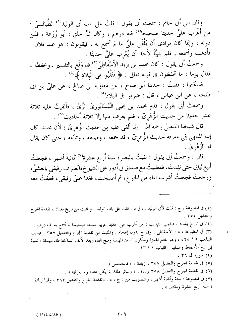 وَقَالَ ابْن أَبى حَاتِم سَمِعت أَبى يَقُول قلت على بَاب أَبى الْوَلِيد الطيالسى من أغرب على حَدِيثا صَحِيحا فَلهُ دِرْهَم وَكَانَ ثمَّ خلق أَبُو زرْعَة فَمن دونه وَإِنَّمَا كَانَ مرادى أَن يلقى على مَا لم أسمع بِهِ فَيَقُولُونَ هُوَ عِنْد فلَان فَأذْهب وأسمعه فَلم يتهيأ لأحد أَن يغرب على حَدِيثا