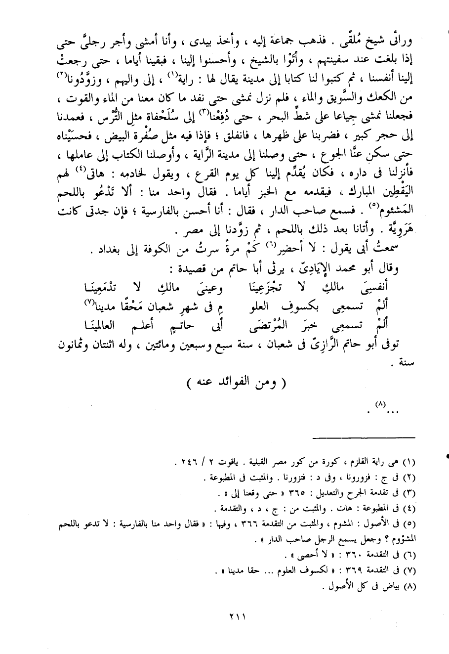 ورائى شيخ ملقى فَذهب جمَاعَة إِلَيْهِ وَأخذ بيدى وَأَنا أمشى وَأجر رجلى حَتَّى إِذا بلغت عِنْد سفينتهم وَأتوا بالشيخ وأحسنوا إِلَيْنَا فبقينا أَيَّامًا حَتَّى رجعت إِلَيْنَا أَنْفُسنَا ثمَّ كتبُوا لنا كتابا إِلَى مَدِينَة يُقَال لَهَا راية إِلَى واليهم وزودونا من الكعك والسويق وَالْمَاء فَلم نزل نمشى حَتَّى نفد مَا كَانَ مَعنا من المَاء والقوت فَجعلنَا نمشى جياعا على شط الْبَحْر حَتَّى دفعنَا إِلَى سلحفاة مثل الترس فعمدنا إِلَى حجر كَبِير فضربنا على ظهرهَا فانفلق فَإِذا فِيهِ مثل صفرَة الْبيض فحسيناه حَتَّى سكن عَنَّا الْجُوع حَتَّى وصلنا إِلَى مَدِينَة الرَّايَة وأوصلنا الْكتاب إِلَى عاملها فأنزلنا فى دَاره فَكَانَ يقدم إِلَيْنَا كل يَوْم القرع وَيَقُول لِخَادِمِهِ هاتى لَهُم اليقطين الْمُبَارك فَيقدمهُ مَعَ الْخبز أَيَّامًا فَقَالَ وَاحِد منا أَلا تَدْعُو بِاللَّحْمِ المشئوم فَسمع صَاحب الدَّار فَقَالَ أَنا أحسن بِالْفَارِسِيَّةِ فَإِن جدتى كَانَت هروية وأتانا بعد ذَلِك بِاللَّحْمِ ثمَّ زودنا إِلَى مصر