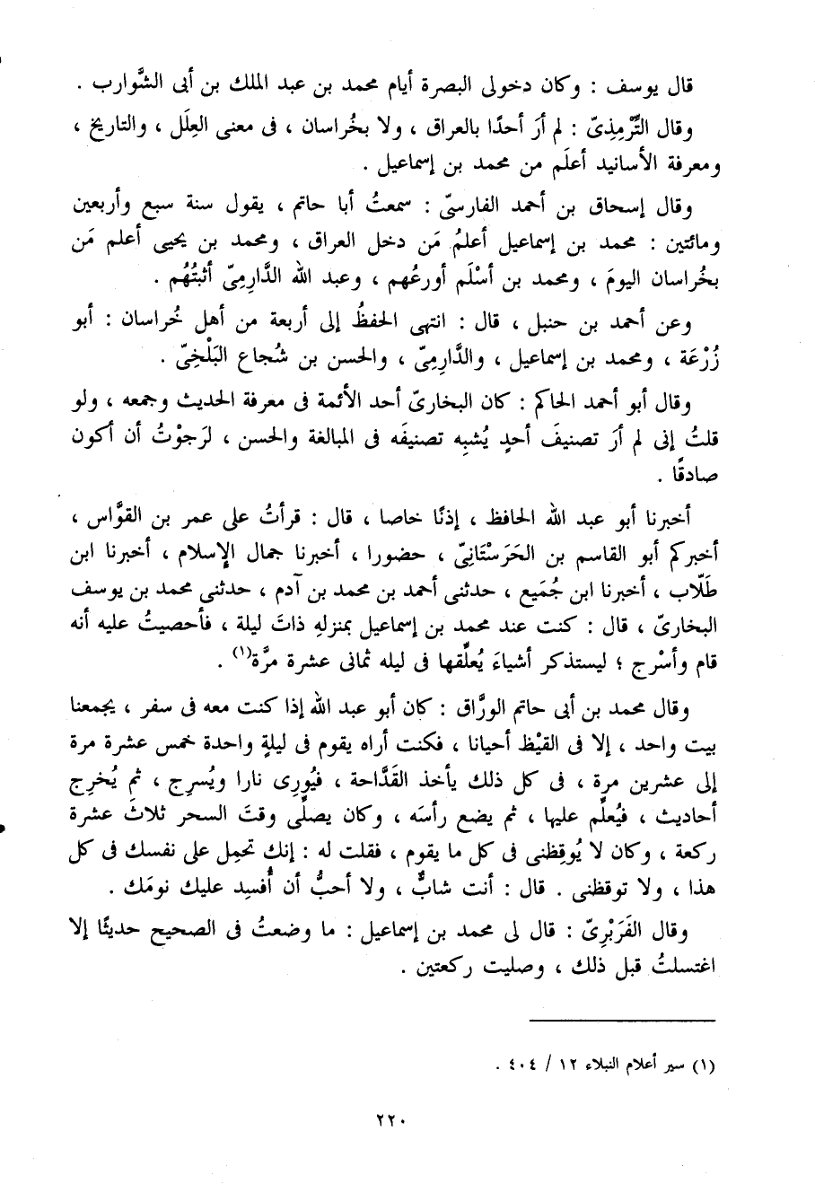 وَقَالَ مُحَمَّد بن أَبى حَاتِم الْوراق كَانَ أَبُو عبد الله إِذا كنت مَعَه فى سفر يجمعنا بَيت وَاحِد إِلَّا فى القيظ أَحْيَانًا فَكنت أرَاهُ يقوم فى لَيْلَة وَاحِدَة خمس عشرَة مرّة إِلَى عشْرين مرّة فى كل ذَلِك يَأْخُذ القداحة فيورى نَارا ويسرج ثمَّ يخرج أَحَادِيث فَيعلم عَلَيْهَا ثمَّ يضع رَأسه وَكَانَ يصلى وَقت السحر ثَلَاث عشرَة رَكْعَة وَكَانَ لَا يوقظنى فى كل مَا يقوم فَقلت لَهُ إِنَّك تحمل على نَفسك فى كل هَذَا وَلَا توقظنى قَالَ أَنْت شَاب وَلَا أحب أَن أفسد عَلَيْك نومك