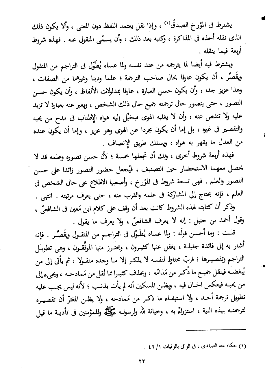 وَيشْتَرط فِيهِ أَيْضًا لما يترجمه من عِنْد نَفسه وَلما عساه يطول فِي التراجم من الْمَنْقُول وَيقصر أَن يكون عَارِفًا بِحَال صَاحب التَّرْجَمَة علما ودينا وَغَيرهمَا من الصِّفَات وَهَذَا عَزِيز جدا وَأَن يكون حسن الْعبارَة عَارِفًا بمدلولات الْأَلْفَاظ وَأَن يكون حسن التَّصَوُّر حَتَّى يتَصَوَّر حَال تَرْجَمته جَمِيع حَال ذَلِك الشَّخْص ويعبر عَنهُ بِعِبَارَة لَا تزيد عَلَيْهِ وَلَا تنقص عَنهُ وَأَن لَا يغلبه الْهوى فيخيل إِلَيْهِ هَوَاهُ الإطناب فِي مدح من يُحِبهُ وَالتَّقْصِير فِي غَيره بل إِمَّا أَن يكون مُجَردا عَن الْهوى وَهُوَ عَزِيز وَإِمَّا أَن يكون عِنْده من الْعدْل مَا يقهر بِهِ هَوَاهُ ويسلك طَرِيق الْإِنْصَاف