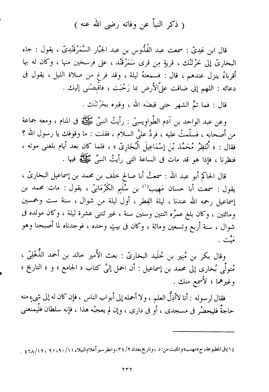 قَالَ الْحَاكِم أَبُو عبد الله سَمِعت أَبَا صَالح خلف بن مُحَمَّد بن إِسْمَاعِيل البخارى يَقُول سَمِعت أَبَا حسان مهيب بن سليم الكرمانى يَقُول مَاتَ مُحَمَّد بن إِسْمَاعِيل رَحمَه الله عندنَا لَيْلَة الْفطر أول لَيْلَة من شَوَّال سنة سِتّ وَخمسين وَمِائَتَيْنِ وَكَانَ بلغ عمره اثْنَتَيْنِ وَسِتِّينَ سنة غير ثنتى عشرَة لَيْلَة وَكَانَ مولده فى شَوَّال سنة أَربع وَتِسْعين وَمِائَة وَكَانَ فى بَيت وَحده فوجدناه لم أَصْبَحْنَا وَهُوَ ميت